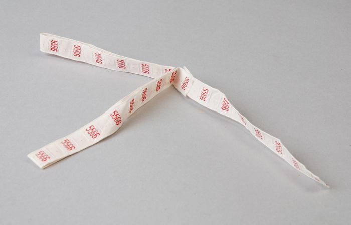 Wasmerkjes, wit lintje met rood ingeweven nummers, i...