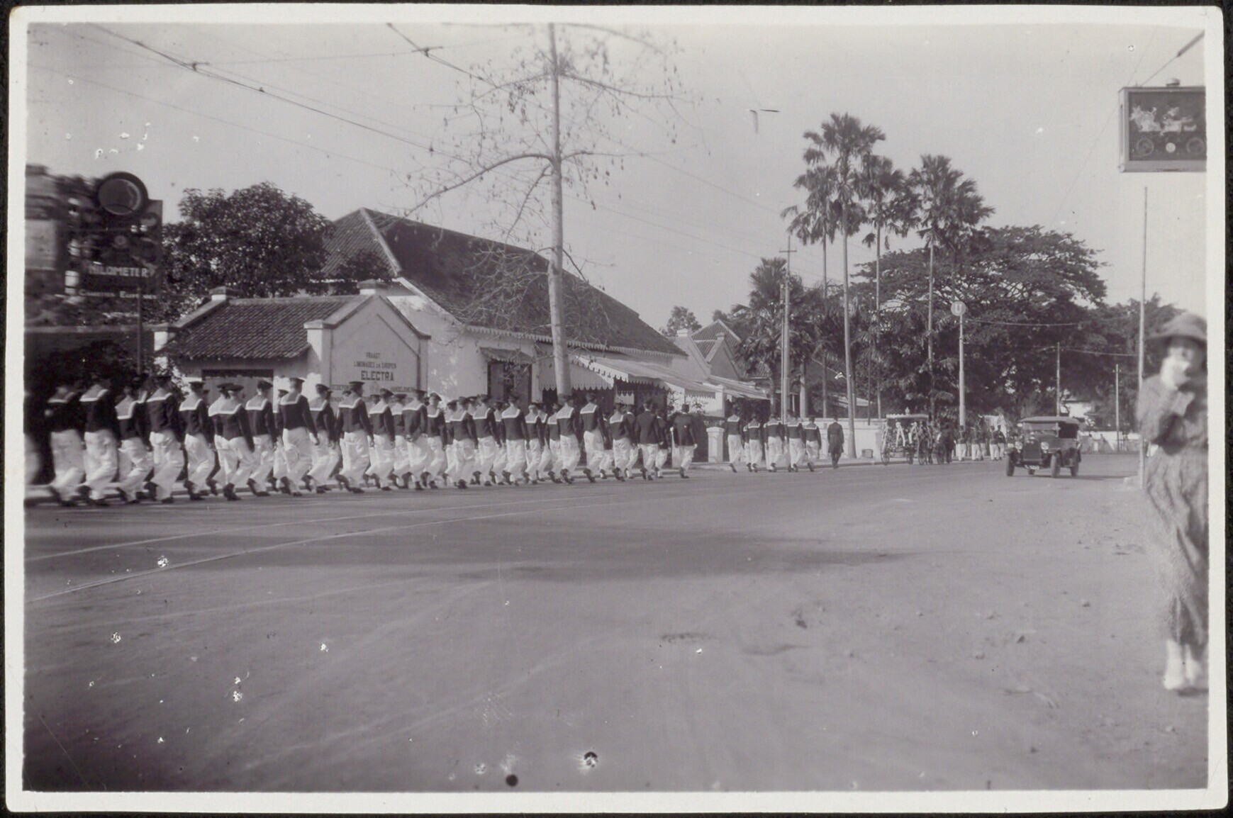 Matrozen lopen in het gelid op een weg