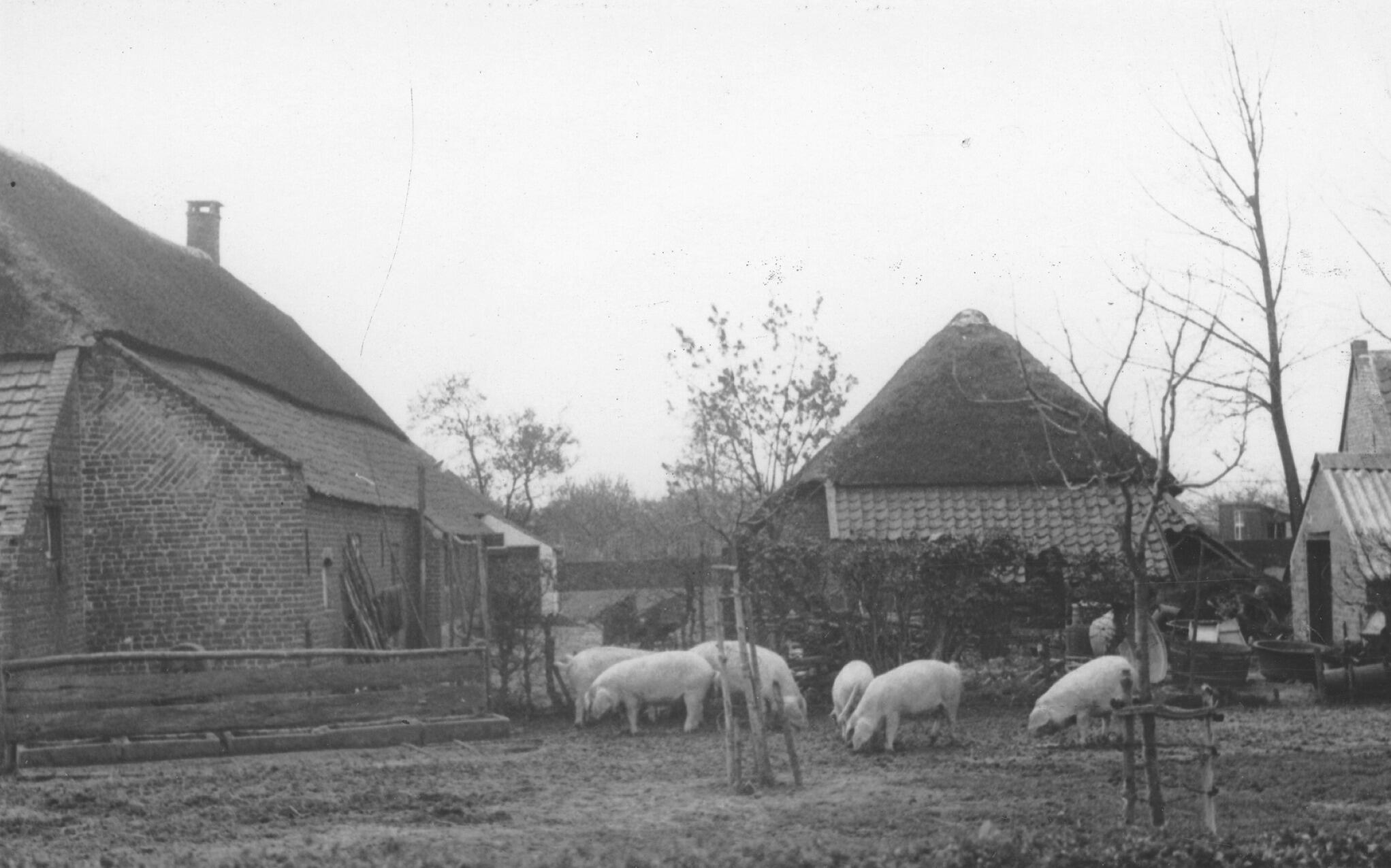Boerenerf met varkens, Asten, 1936 (zwart-wit foto)