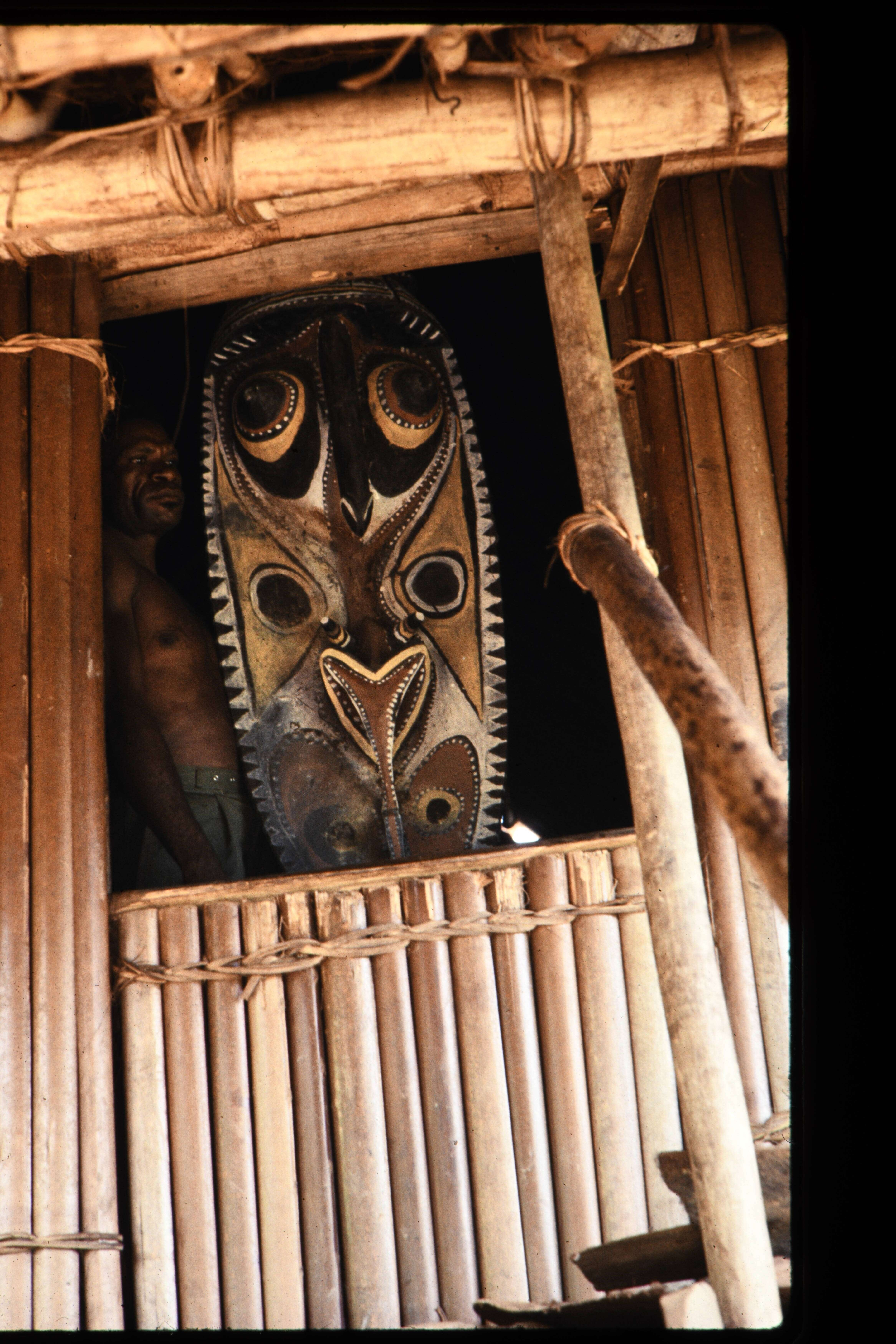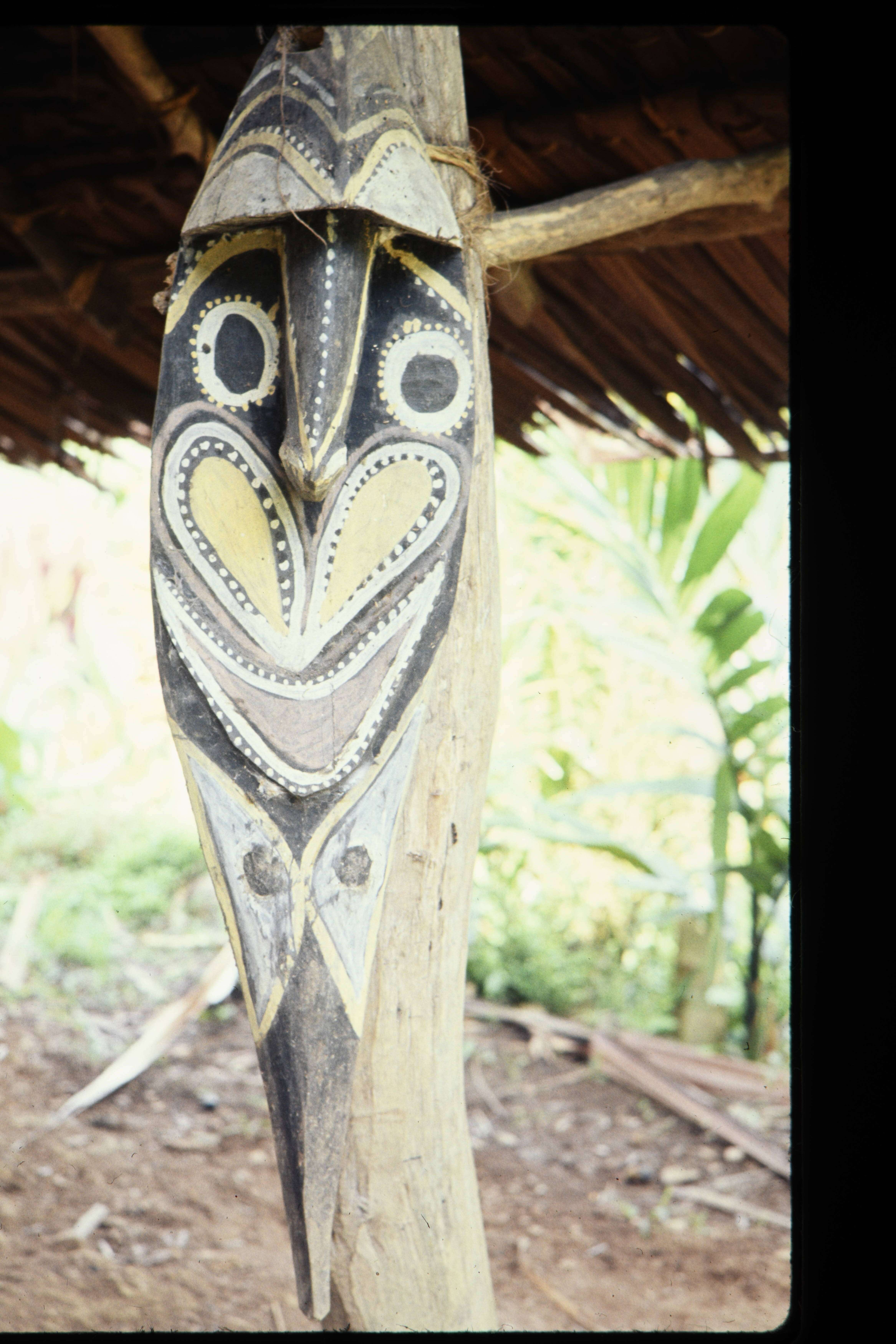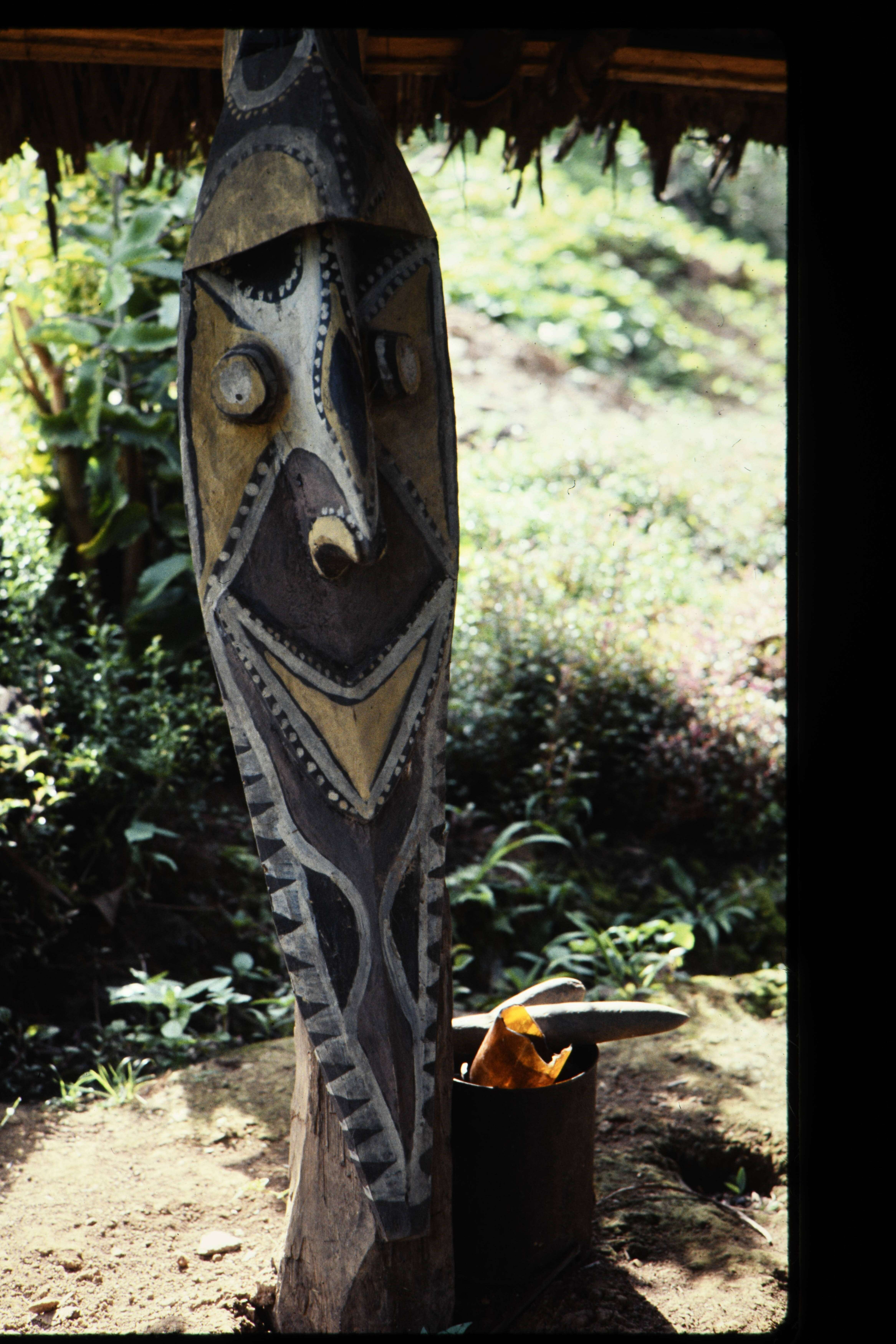 Sacrale houtsculptuur in dorp Minau, Waskkuk. Manggr...