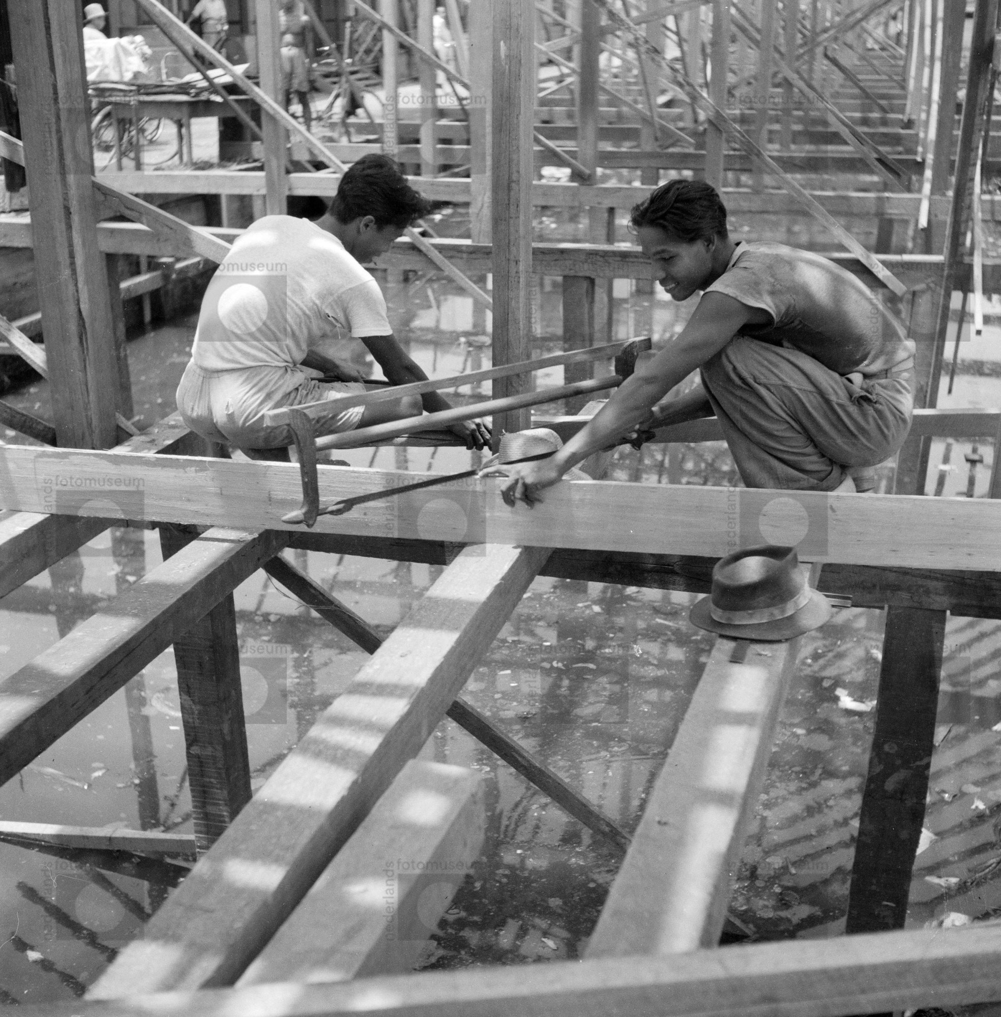 Bouw van een paalwoning in Pontianak op Borneo, Indo...