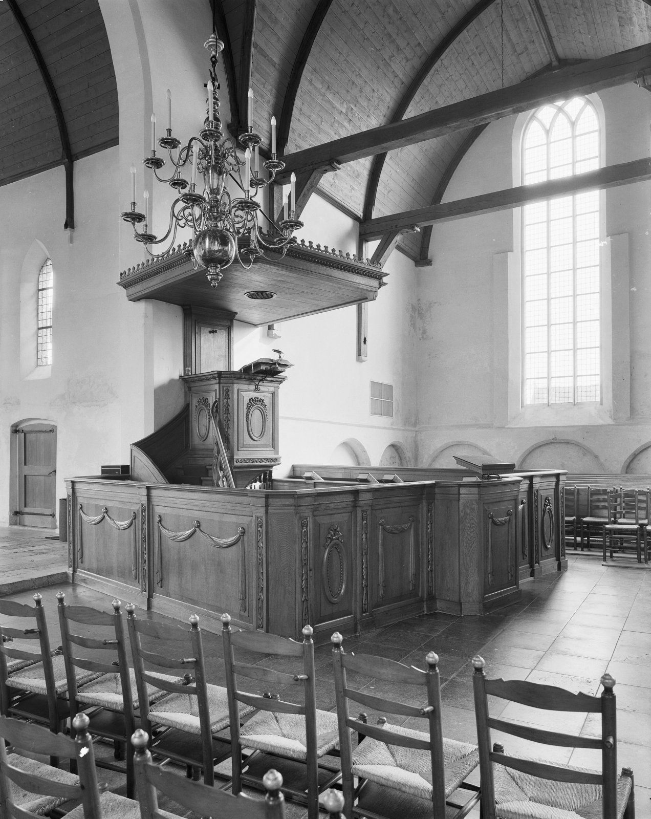 Interieur, preekstoel en doophek