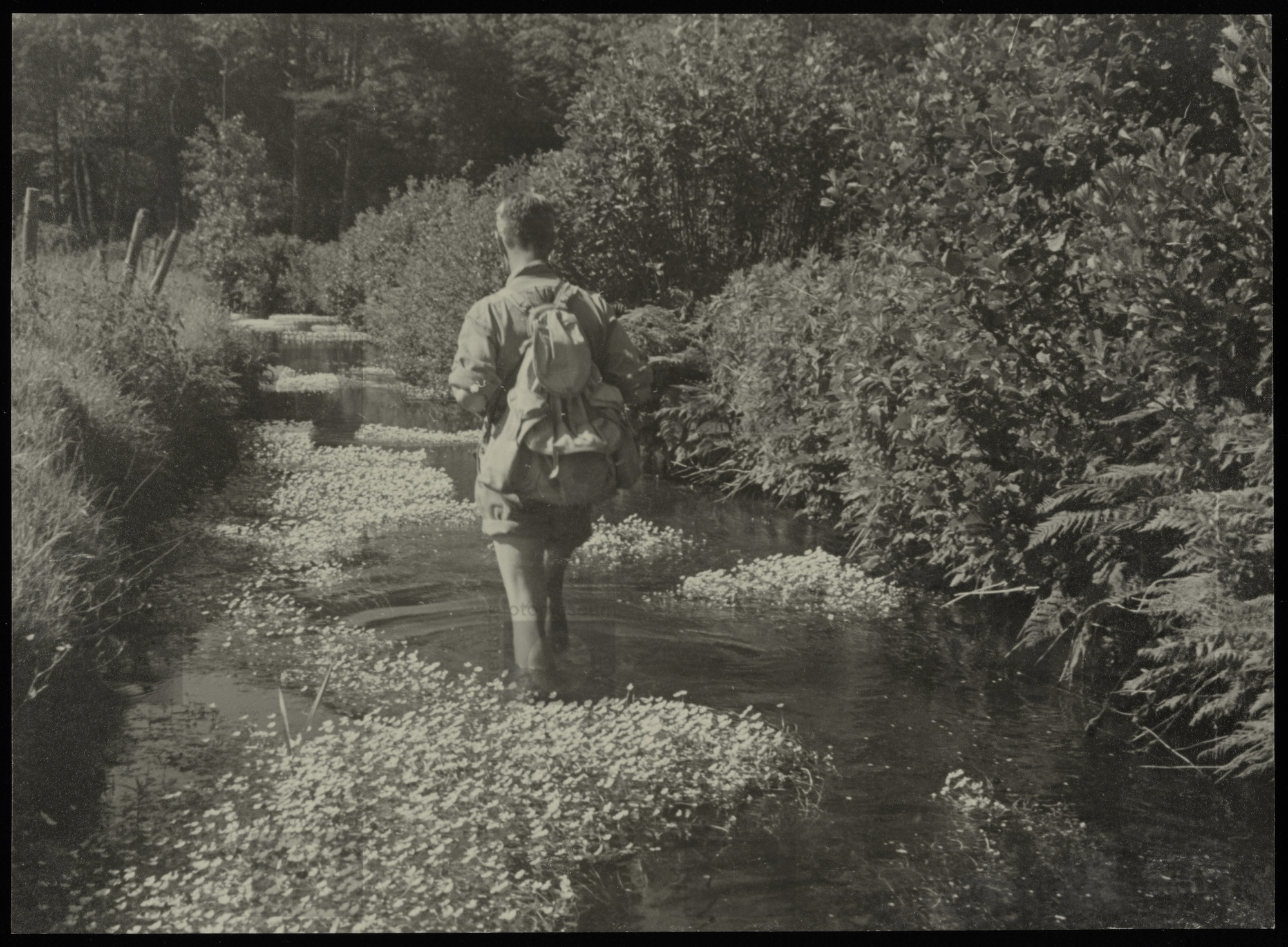 Niko Tinbergen loopt door Hierdense beek, Gelderland...