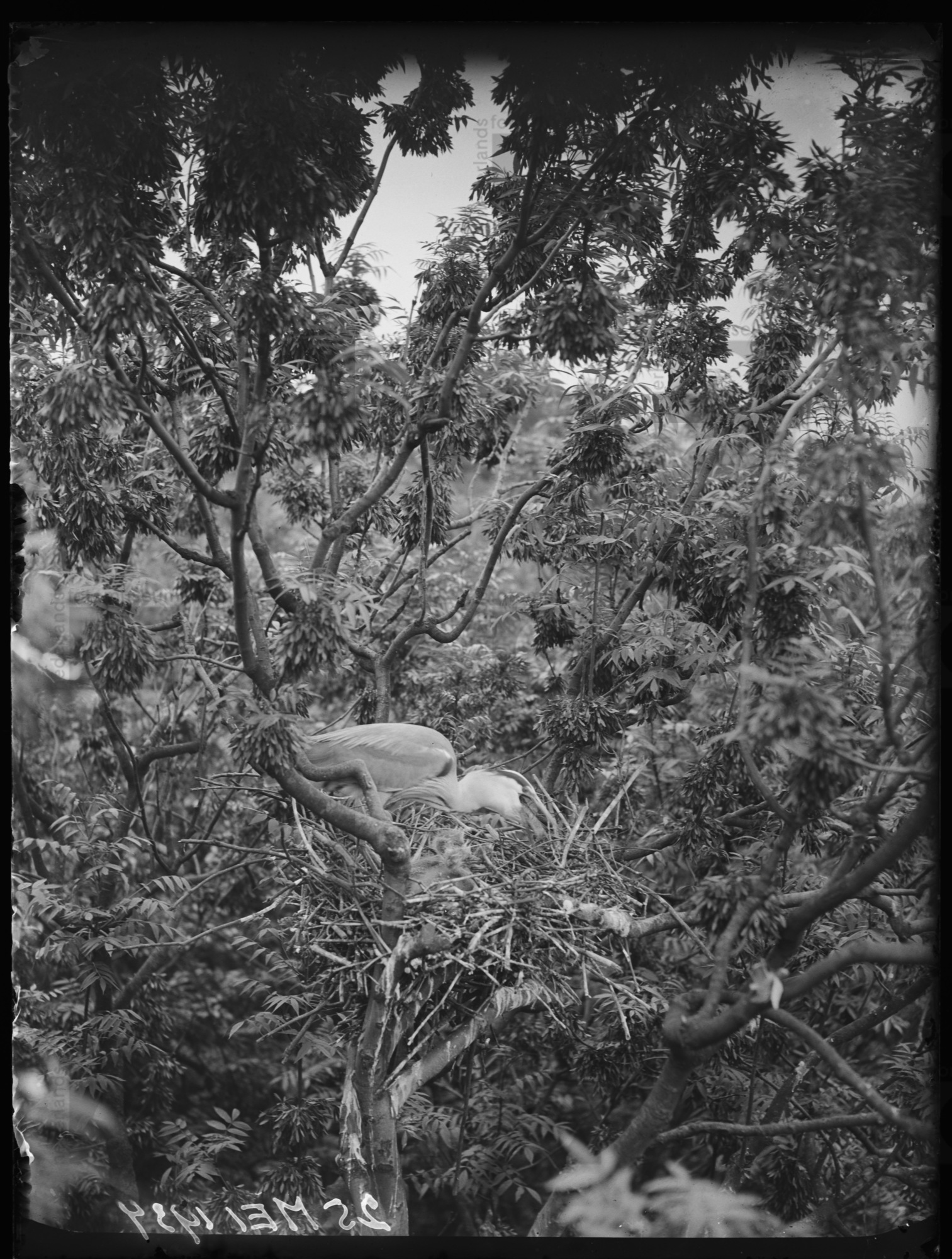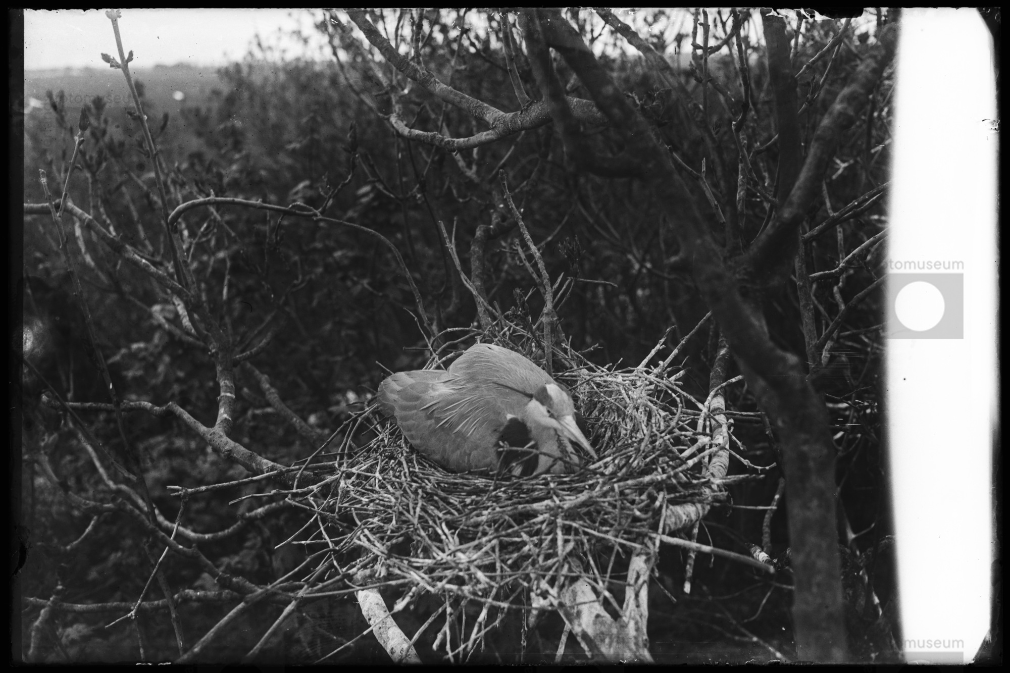 Blauwe reiger op nest met jongen, Sloten (1928)