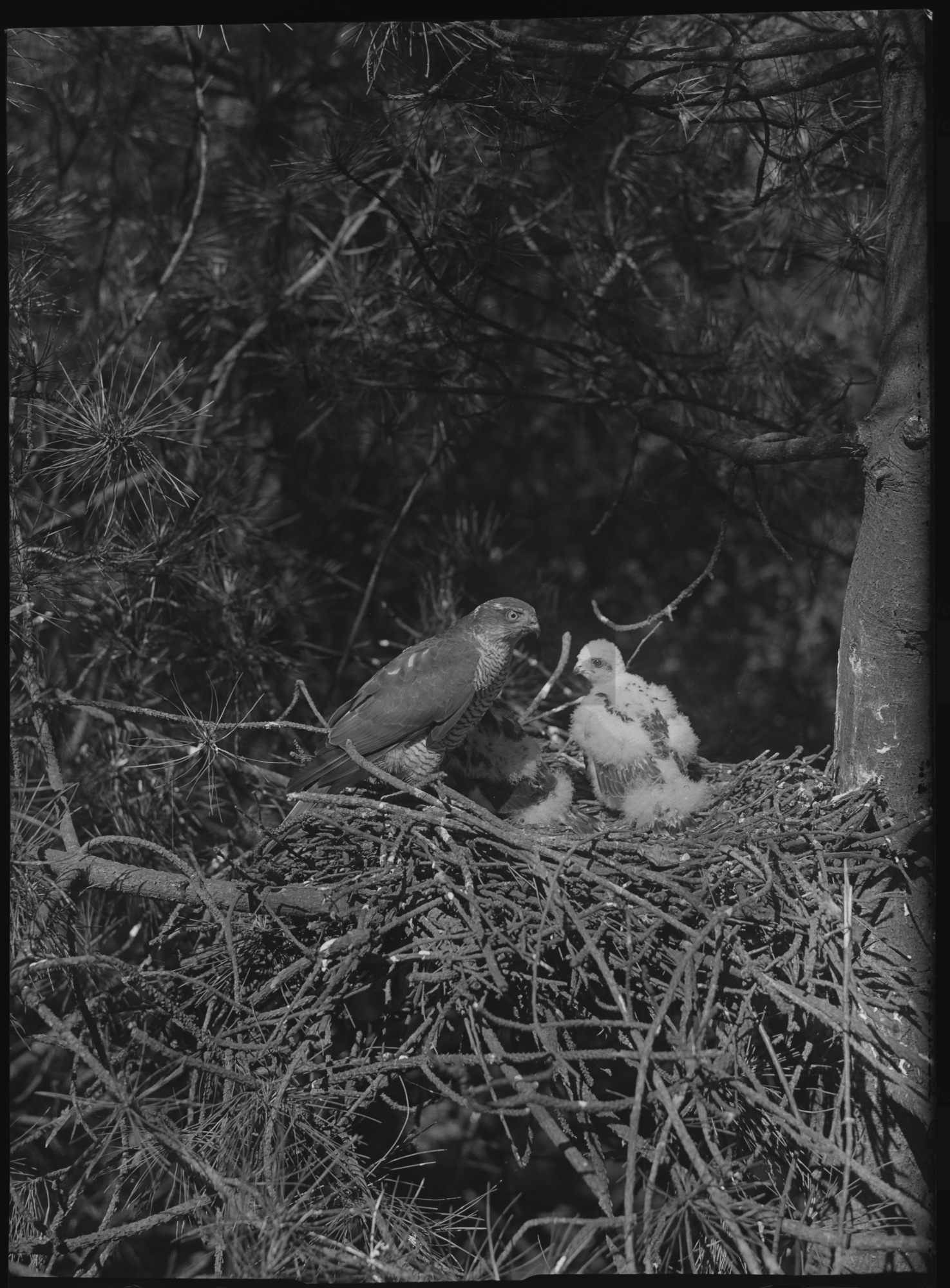 Vrouwtje Sperwer bij haar nest met jongen, Bakkum (1...