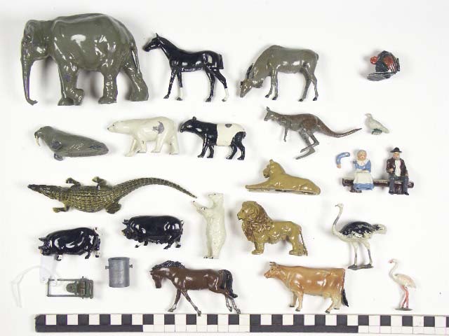 Kistje met schuifdeksel met tinnen soldaatjes, op he...