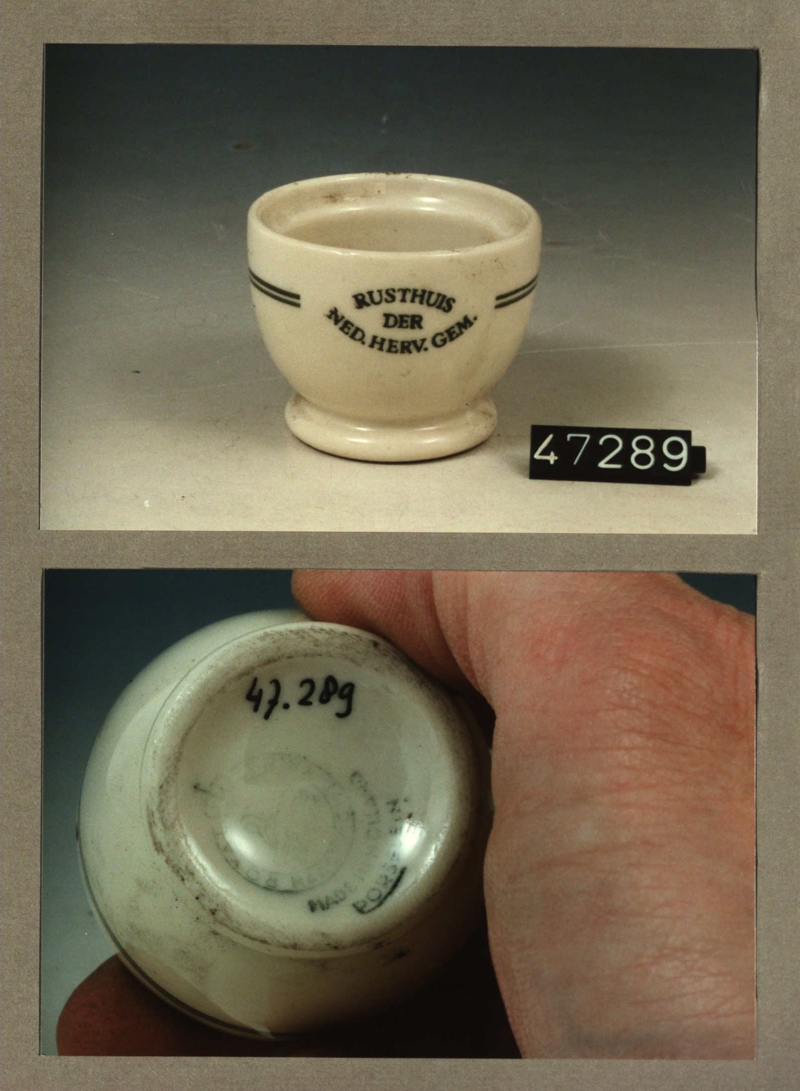 Eierdop, model C met decor Rusthuis der Ned.Herv.gem.