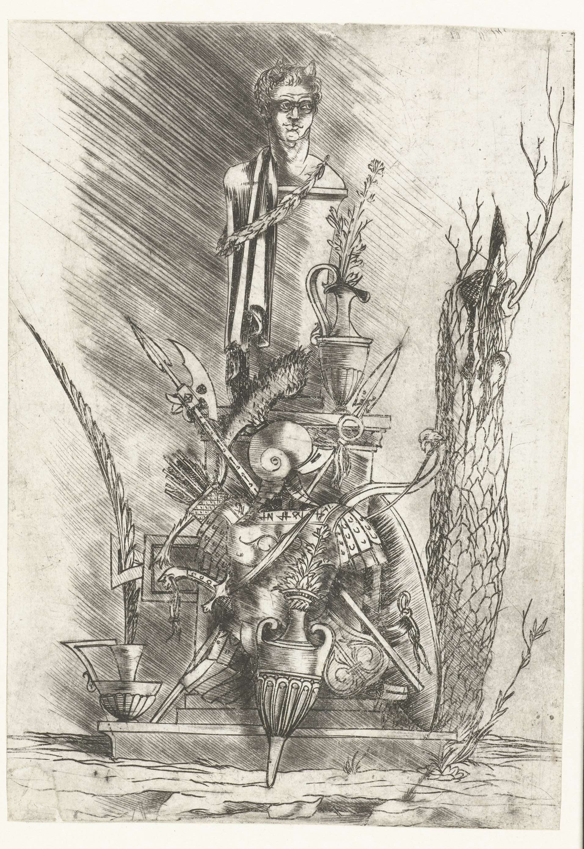 Buste van Pan op zuil en wapentrofeeën