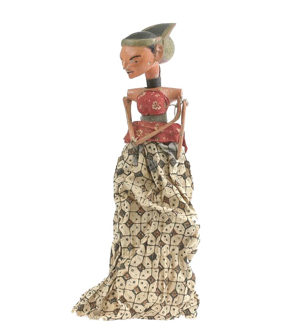 Ronde houten wayangpop (golek) voorstellend een vrou...