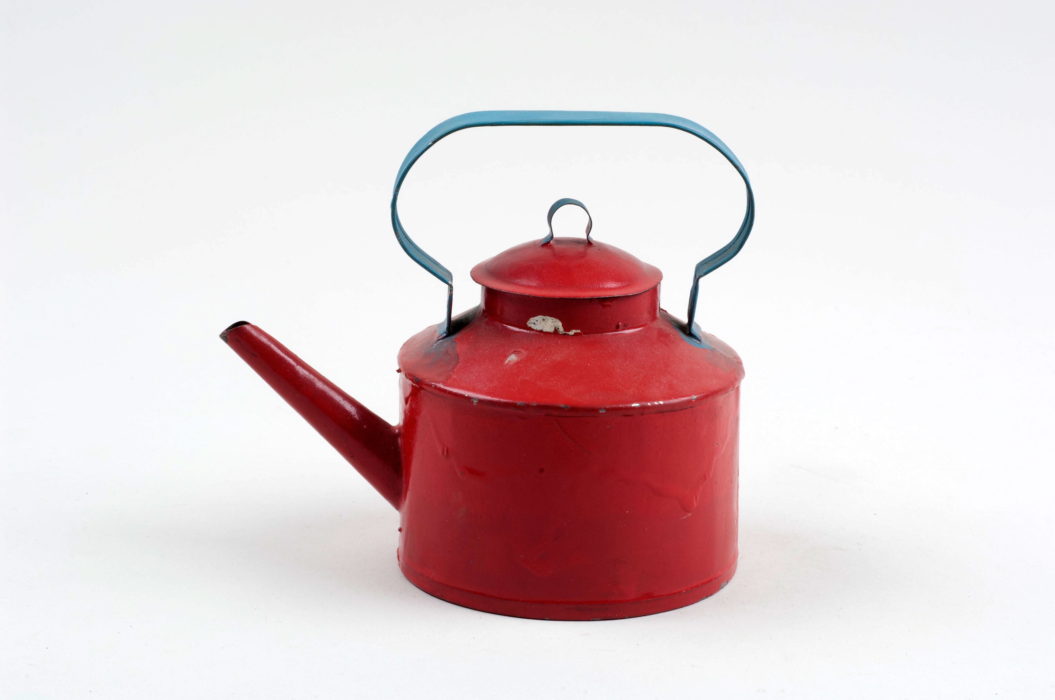 Een blikken speelgoed waterketel (a) met (deksel b)