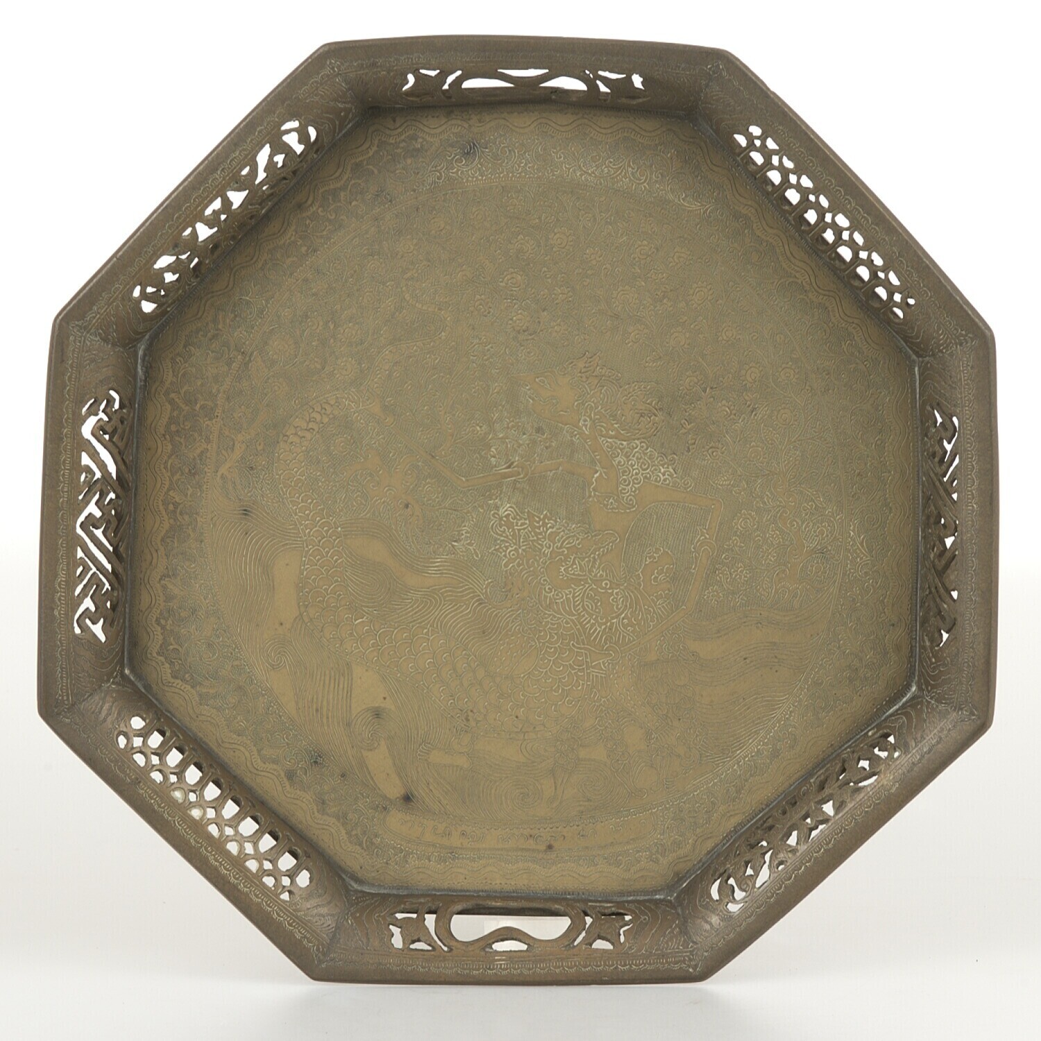 Achthoekig messing presenteerblad met wajangfiguur e...