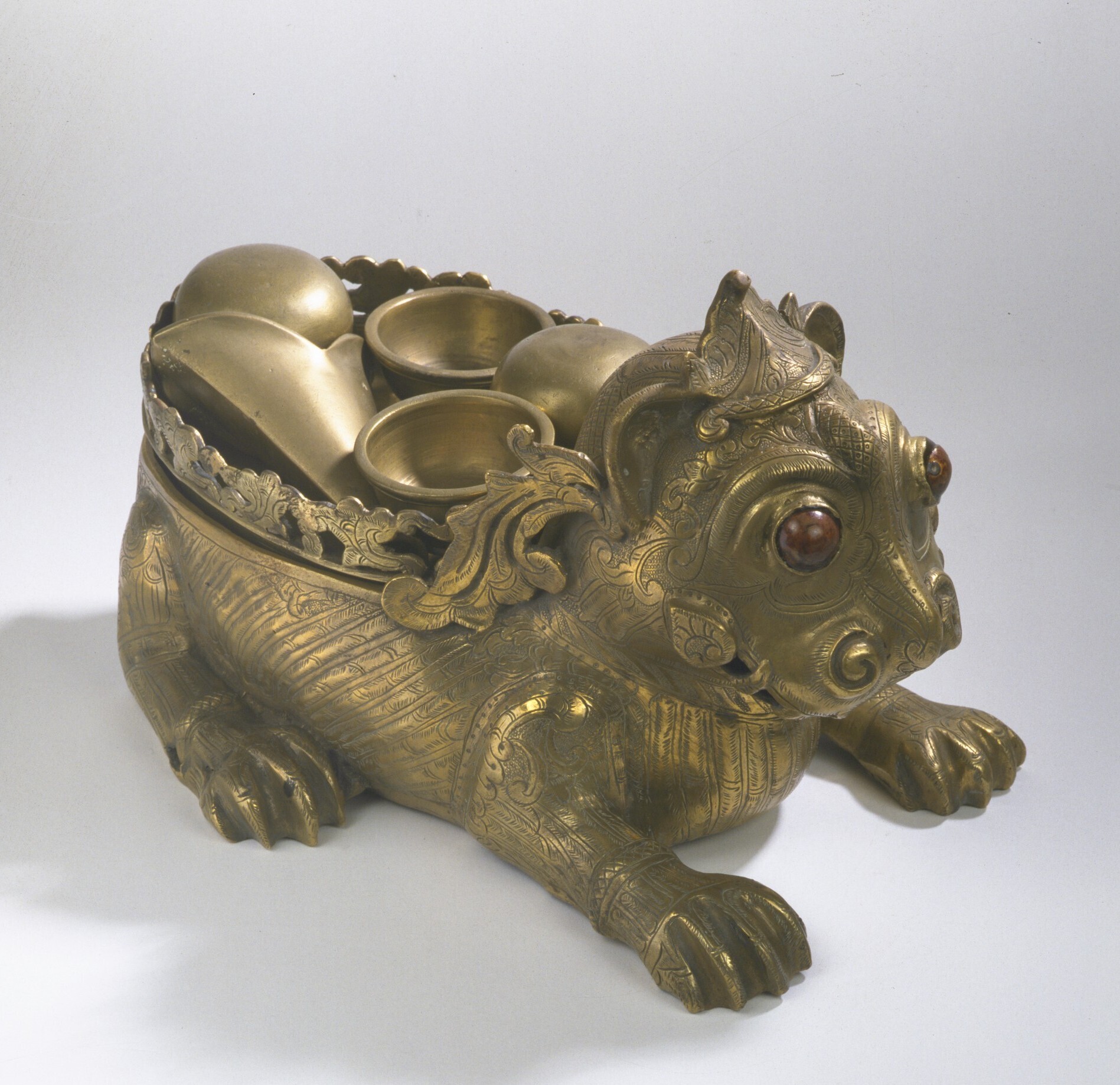 Messingen sirihdoos in de vorm van een leeuw, onderd...