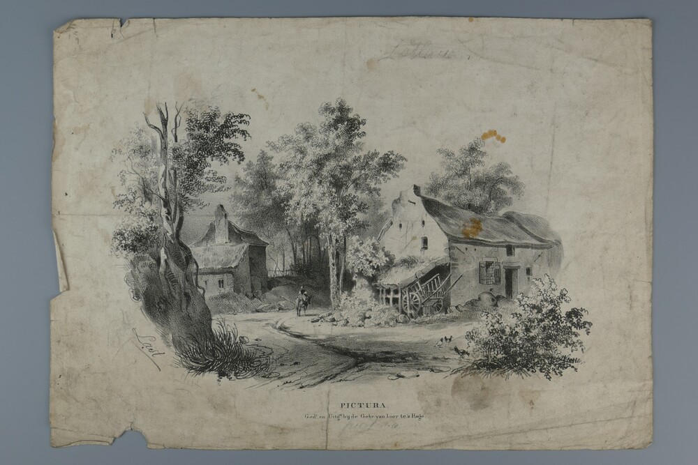Litho, voorstellende landweg met boerdrijen, circa 1870