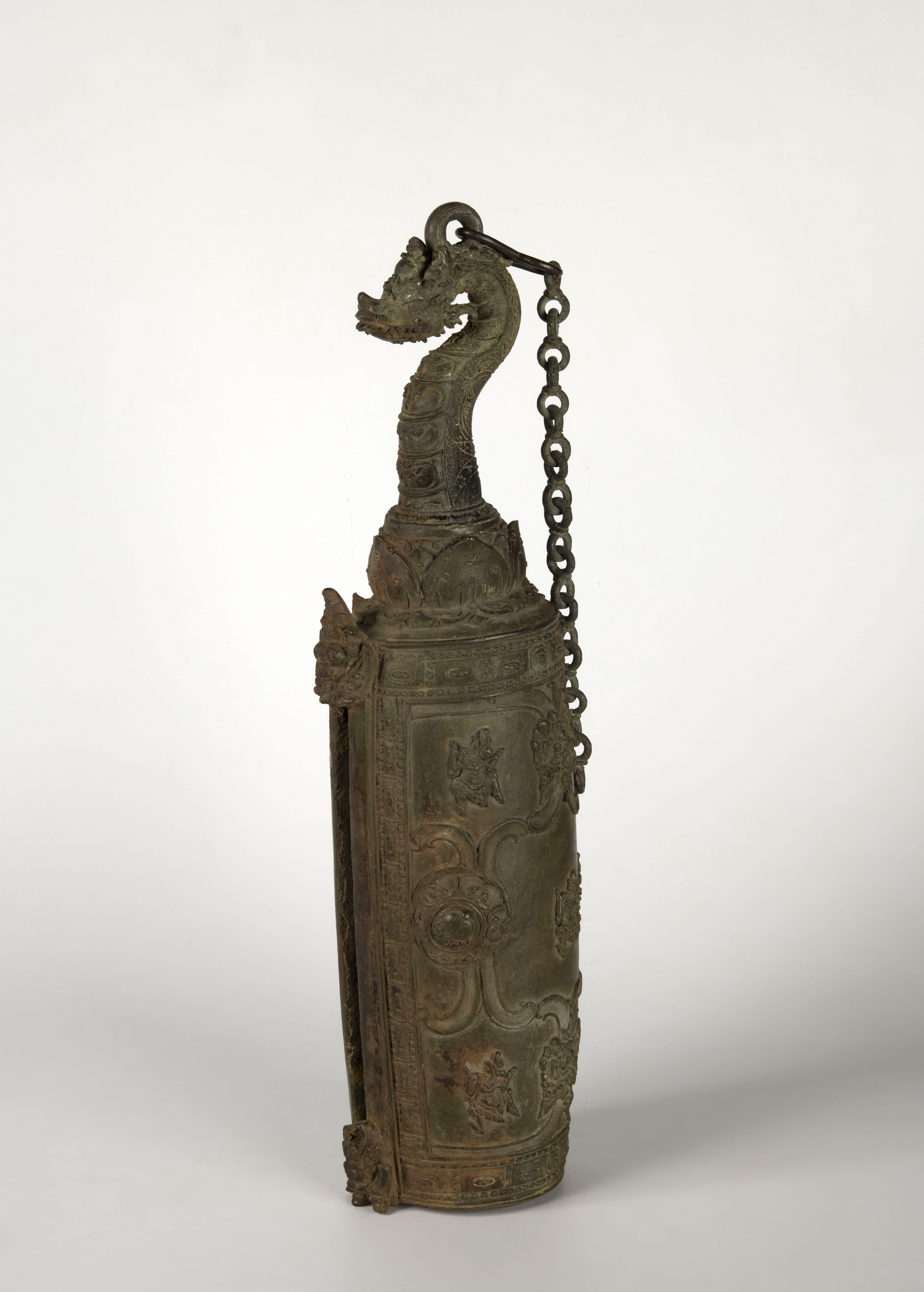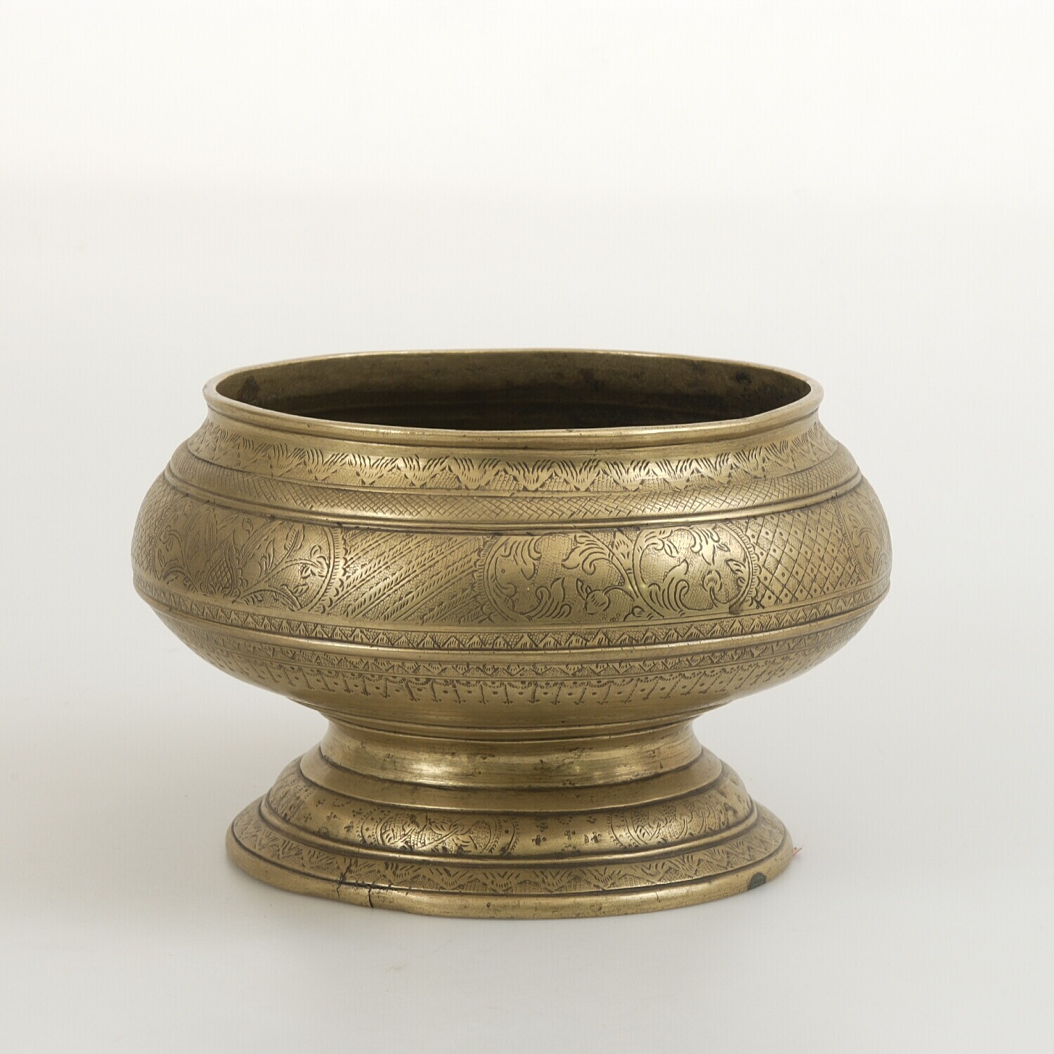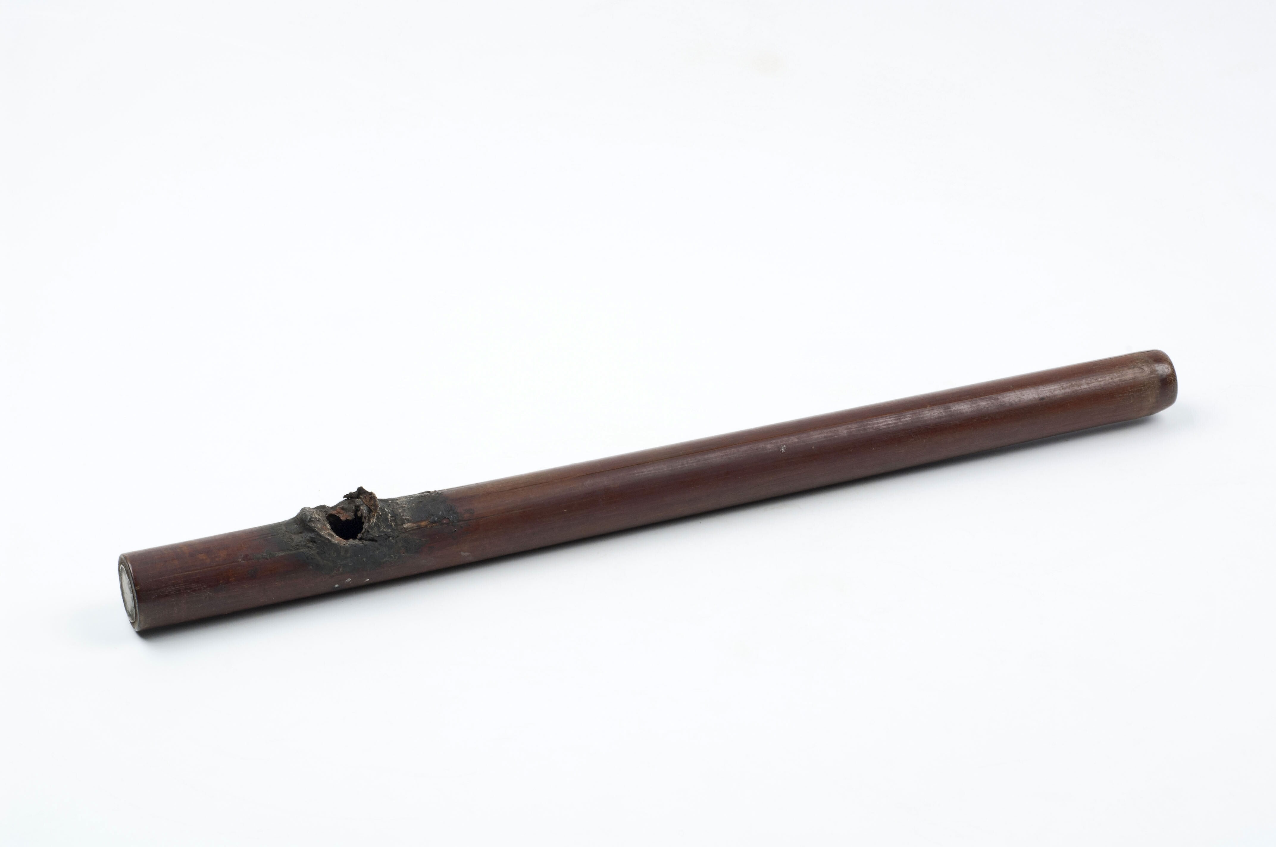 Bamboe opiumpijp met aardewerken kop en koperen plaat