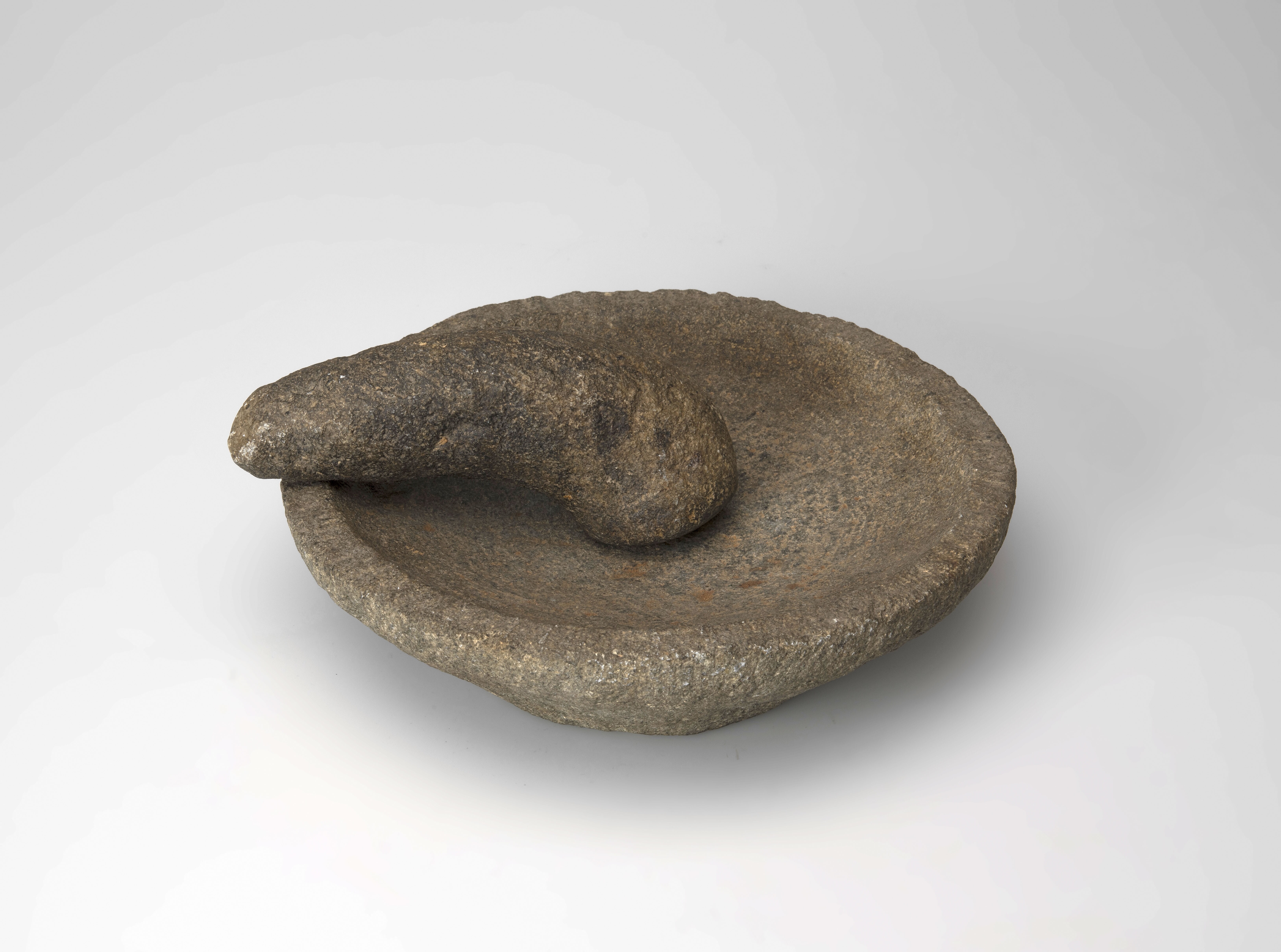 Stenen vijzel met wrijfsteen voor de bereiding van g...