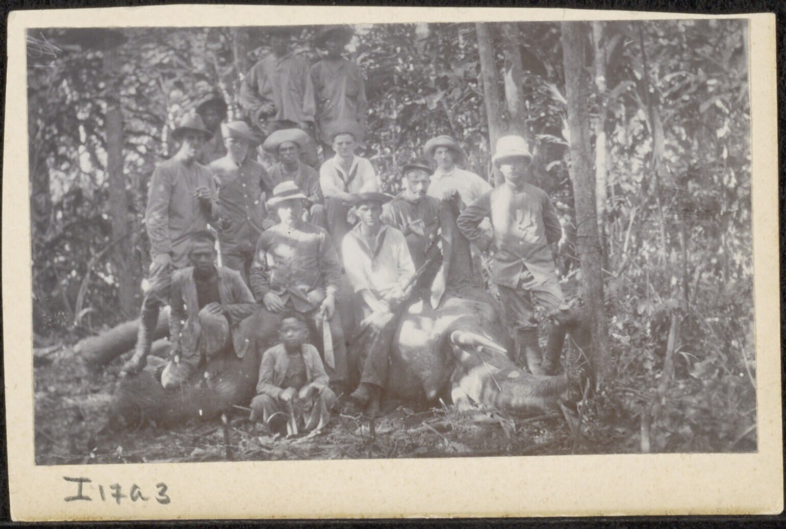 Groepsportret bij een dode olifant in het bos