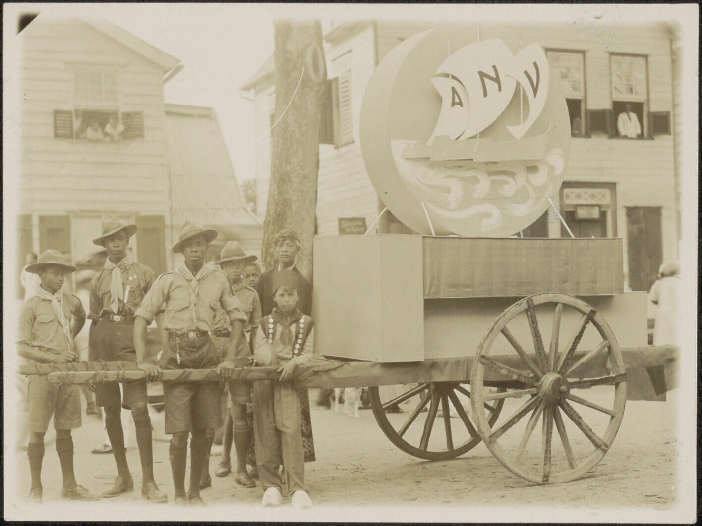 Padvinders lopen met een kar van het Algemeen Nederl...