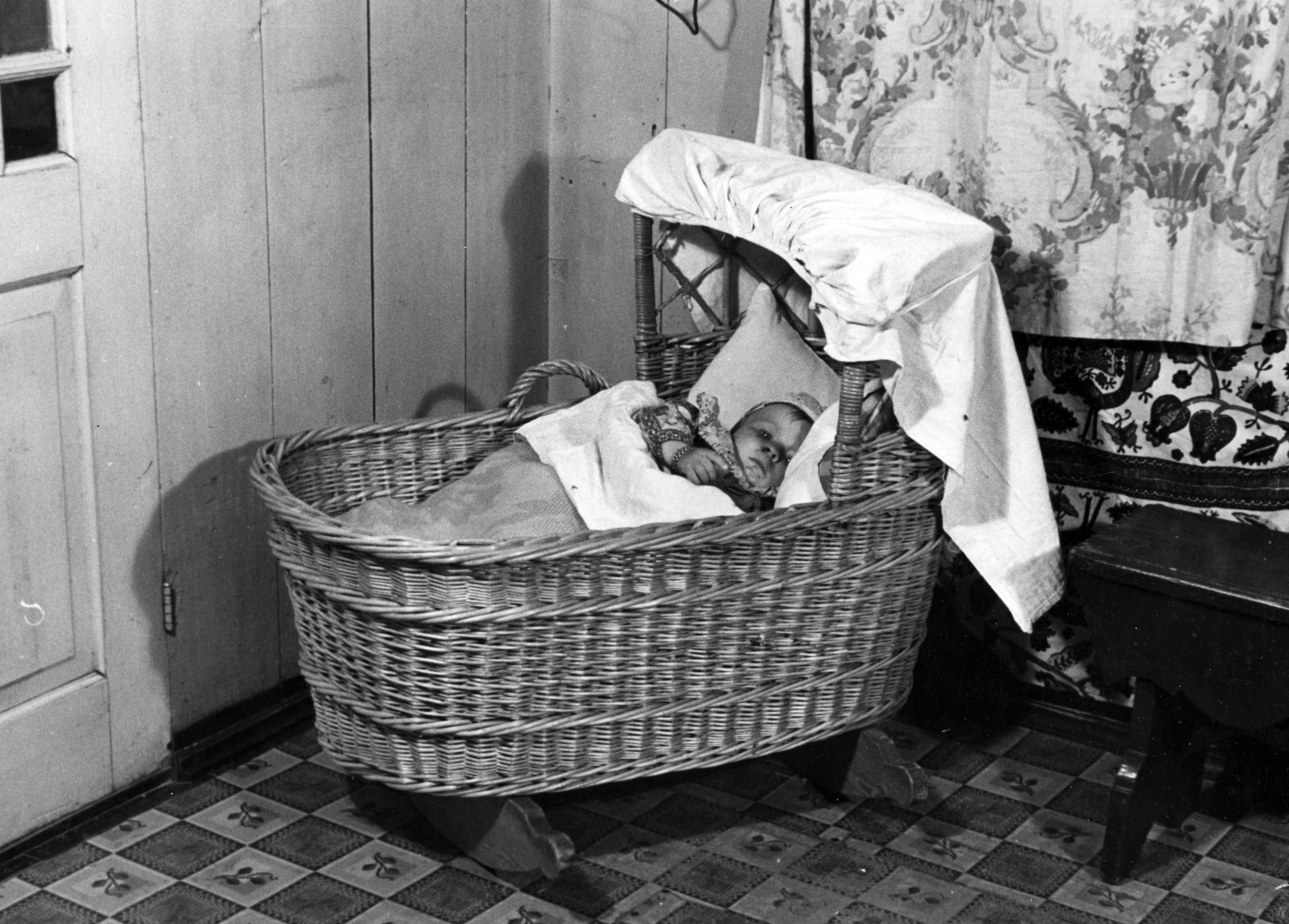 Kind in een wieg, Marken, 1943 (zwart-wit foto)