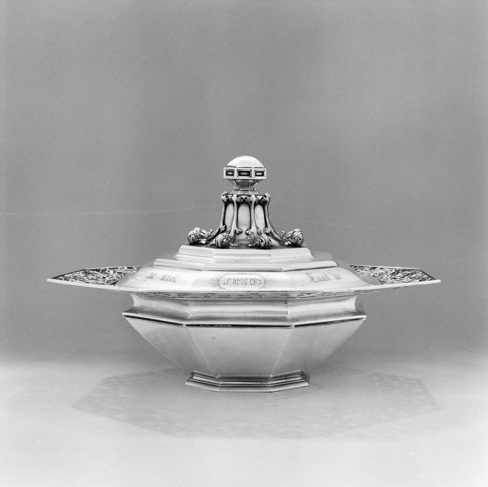 Interieur, zilveren schaal met deksel