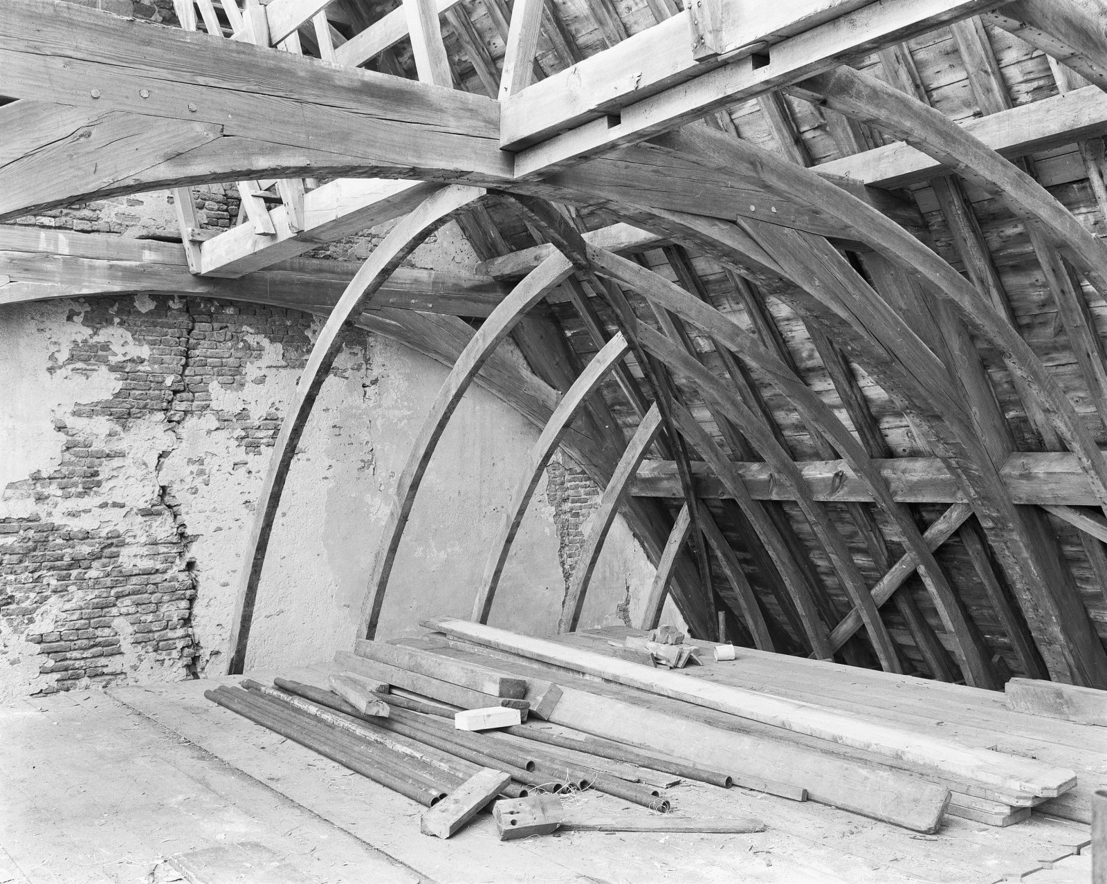 Interieur, kapconstructie westgevel tijdens restauratie