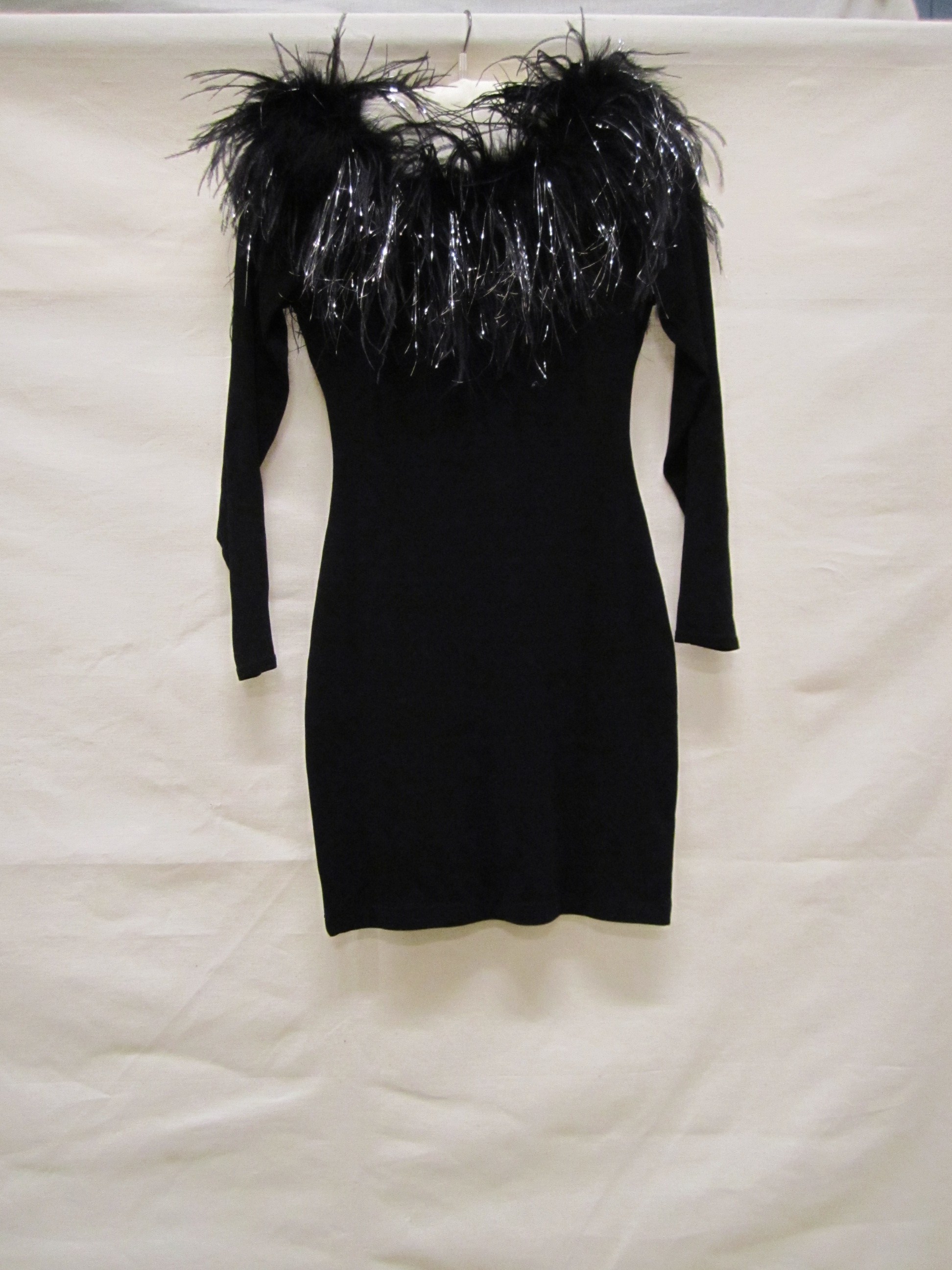 Avondjurk van zwarte crêpe, langs hals struisveren e...