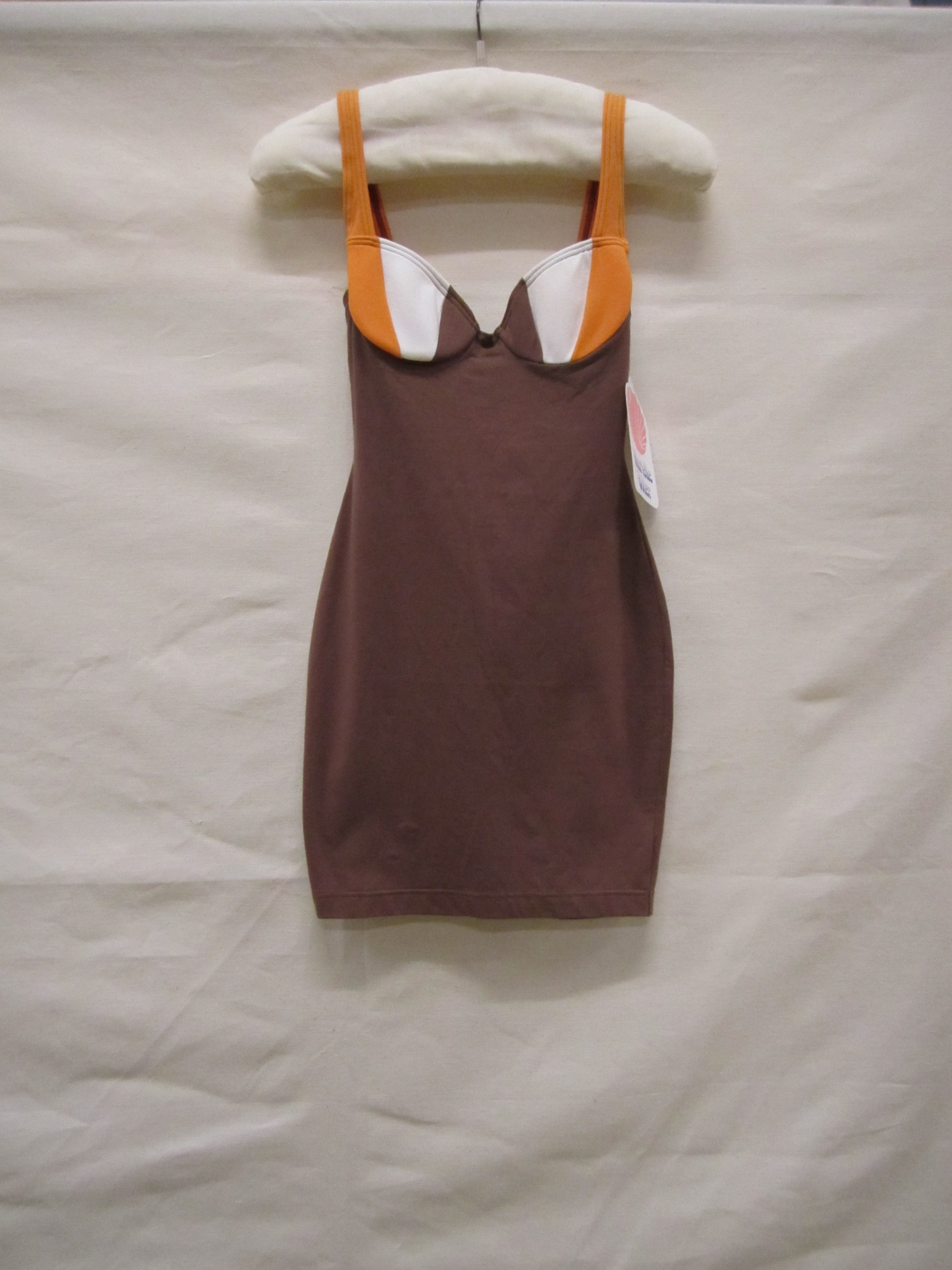 Mini-jurk van bruin tricot met oranje en wit, kort, ...