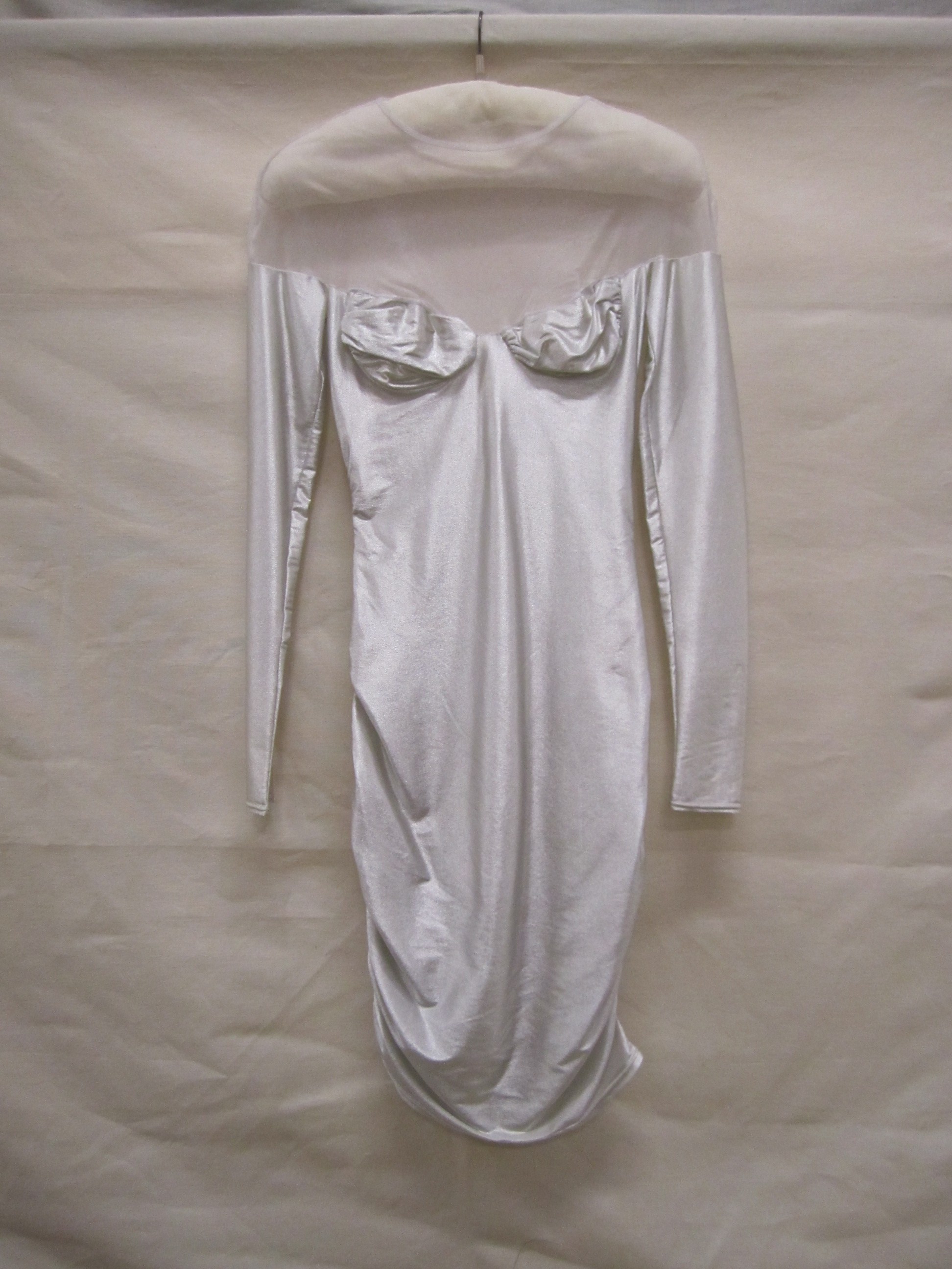 Avondjurk van zilverkleurige stof met glimmende coat...
