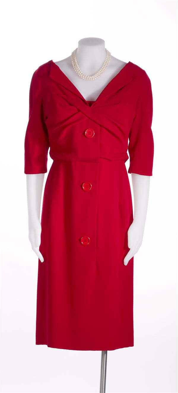 Jurk, middagjurk van rode wollen crêpe, gedrapeerd l...