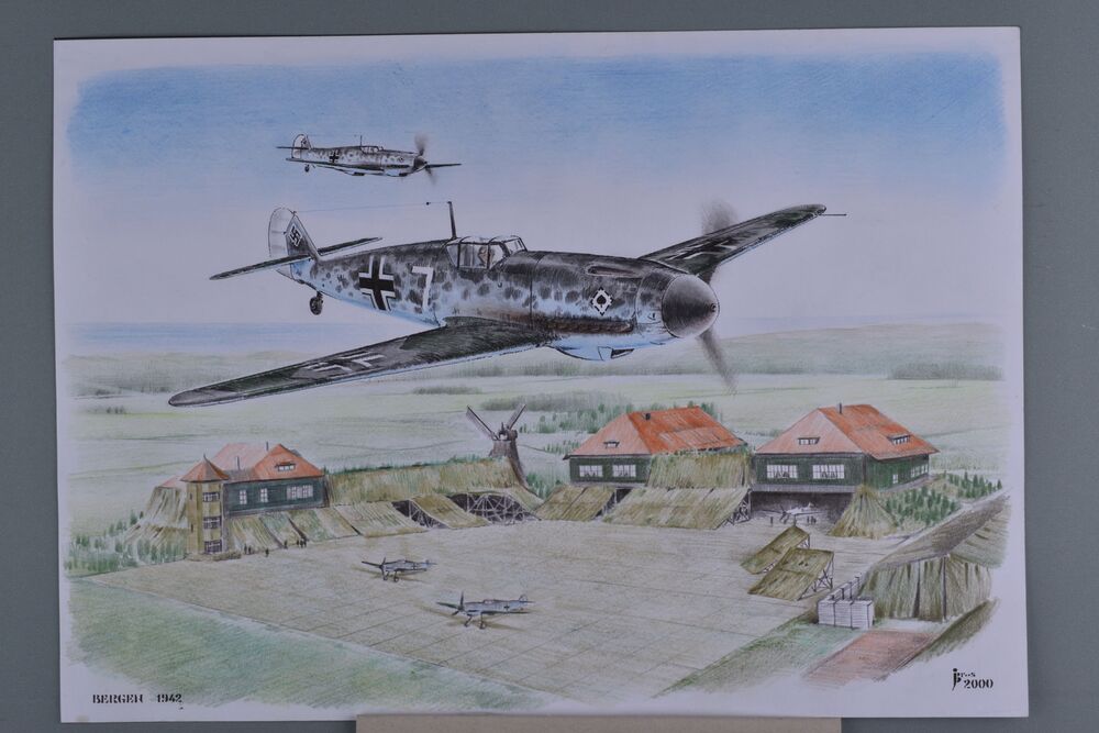 Pasteltekening 'Bergen 1942' met Bf-109 boven vliegv...