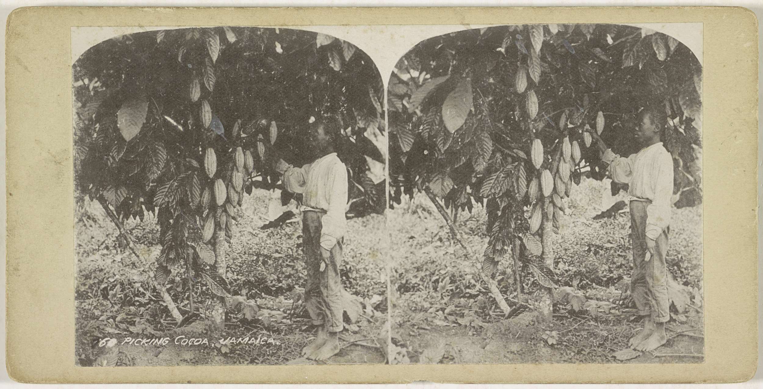 Plukker en cacaoboom in Jamaica