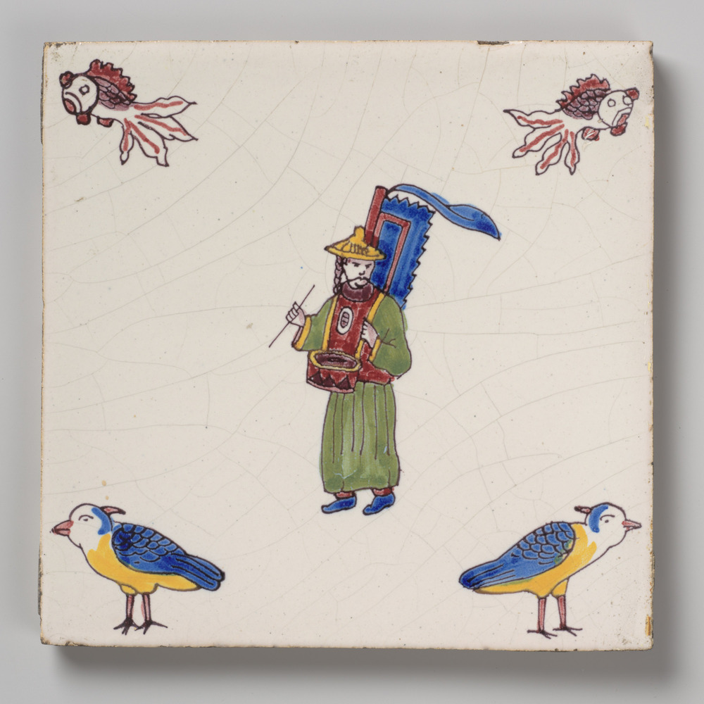 tegel van aardewerk met tinglazuur, voorstellende: v...
