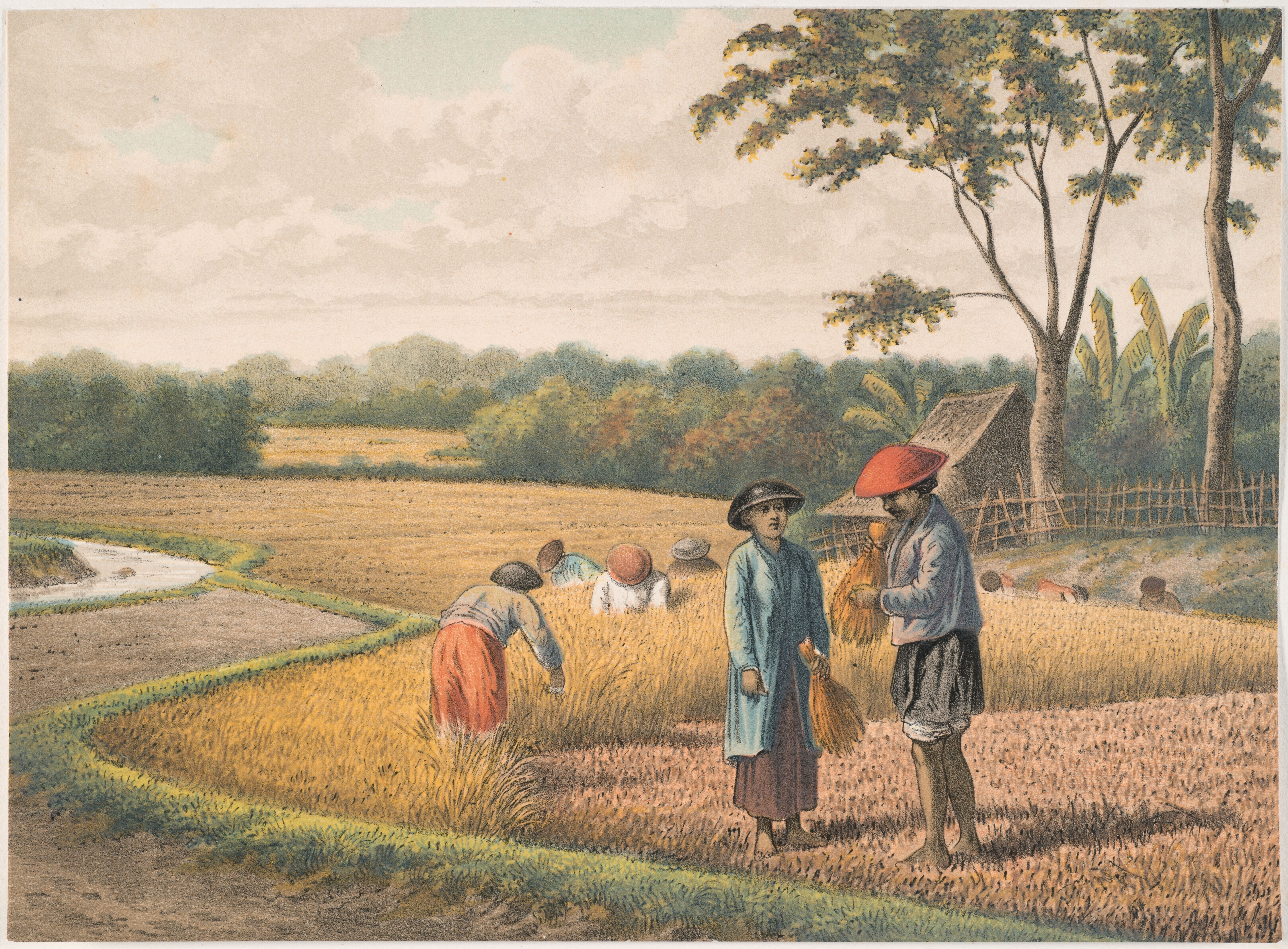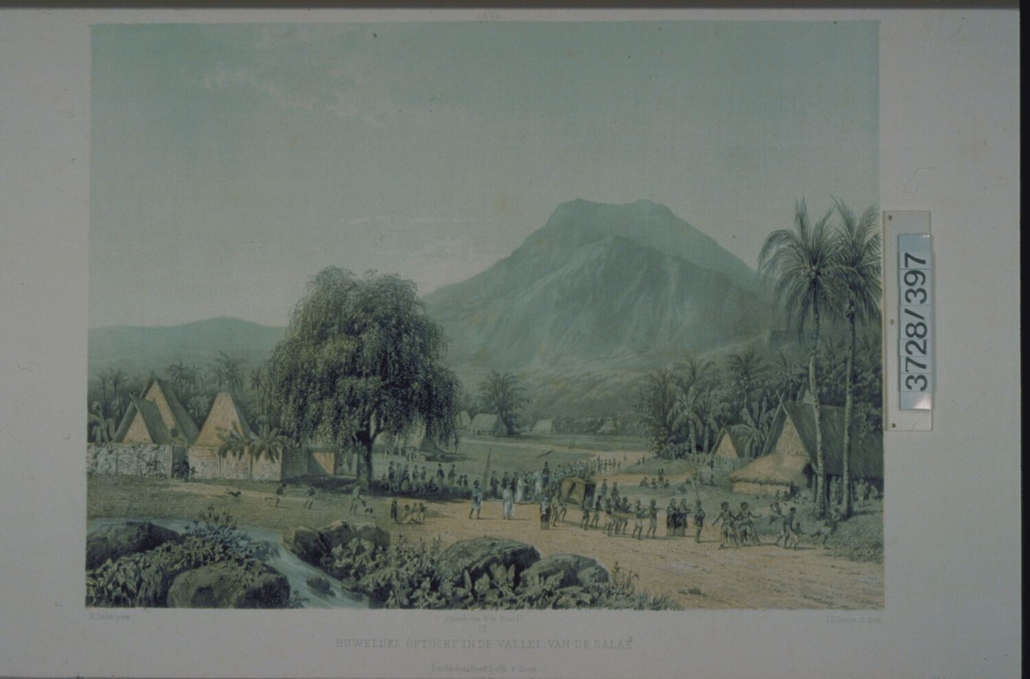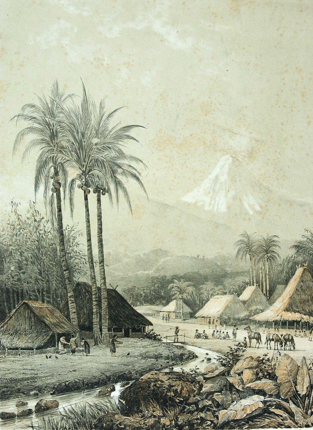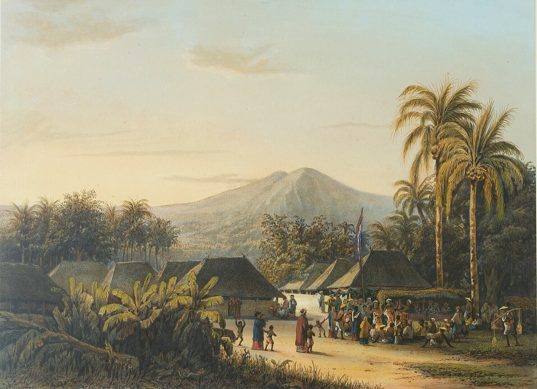 Dorpsgezicht met de vulkaan Smeroe op de achtergrond
