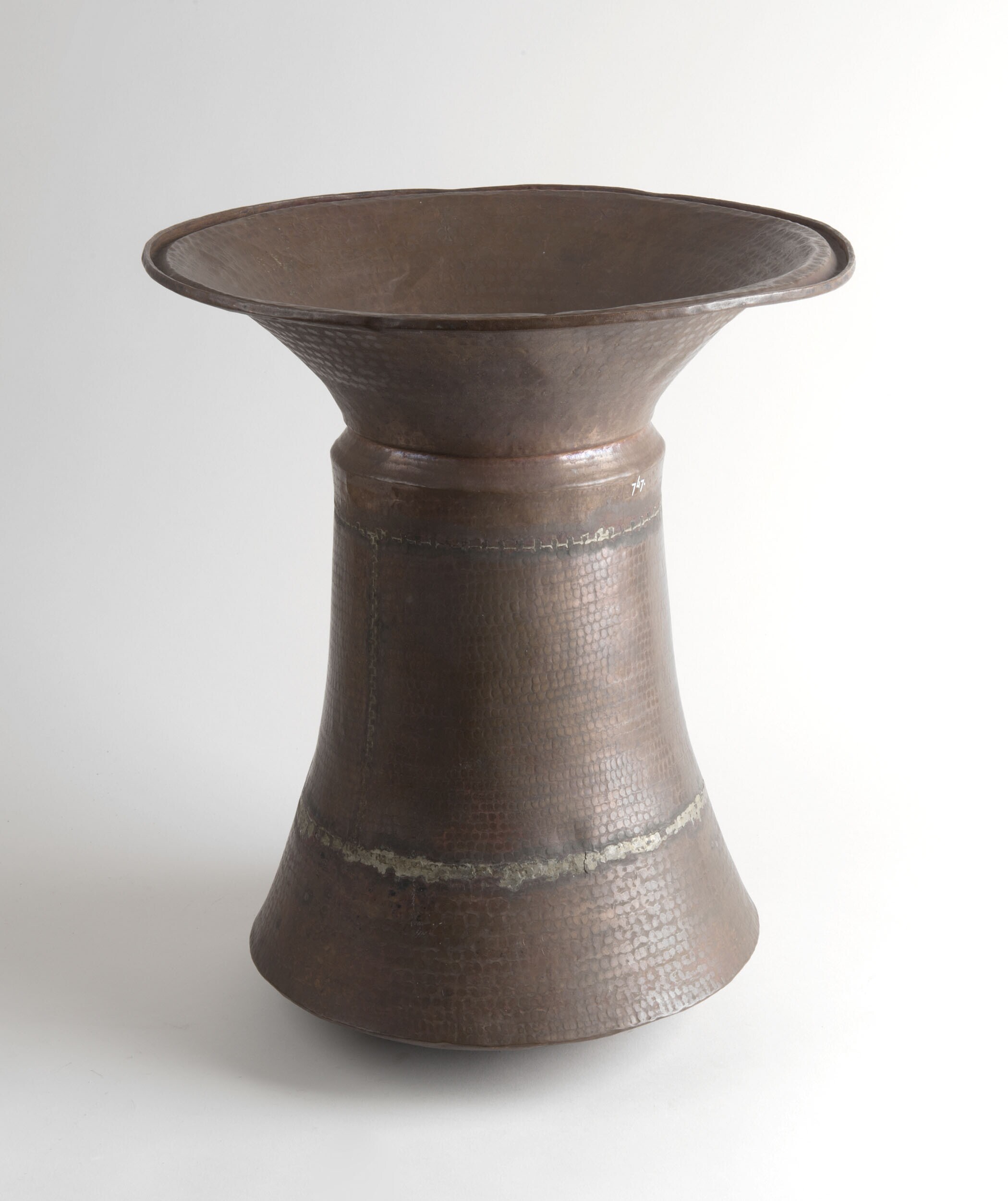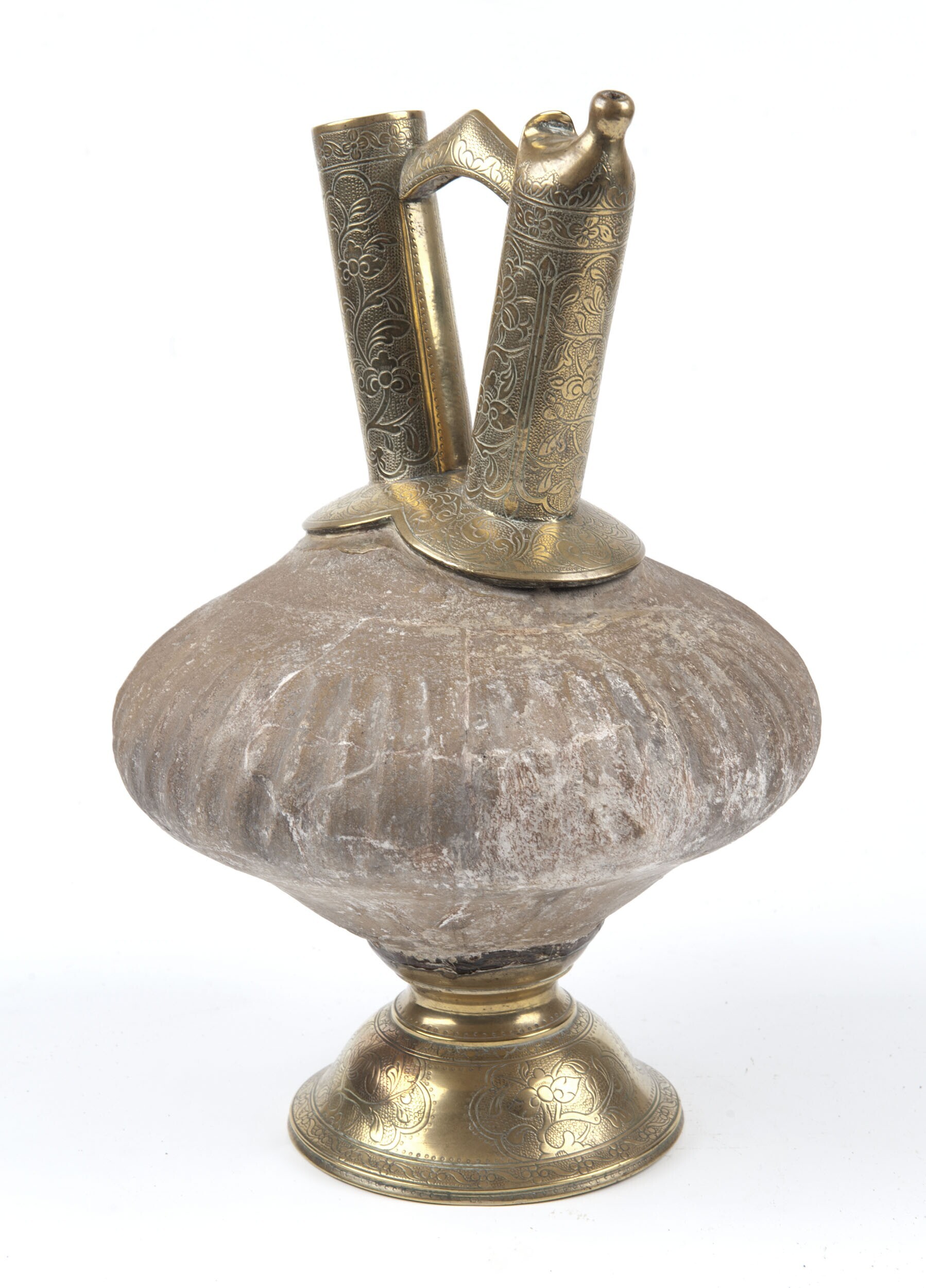 Earthenware water jar with copper alloy base and neck
