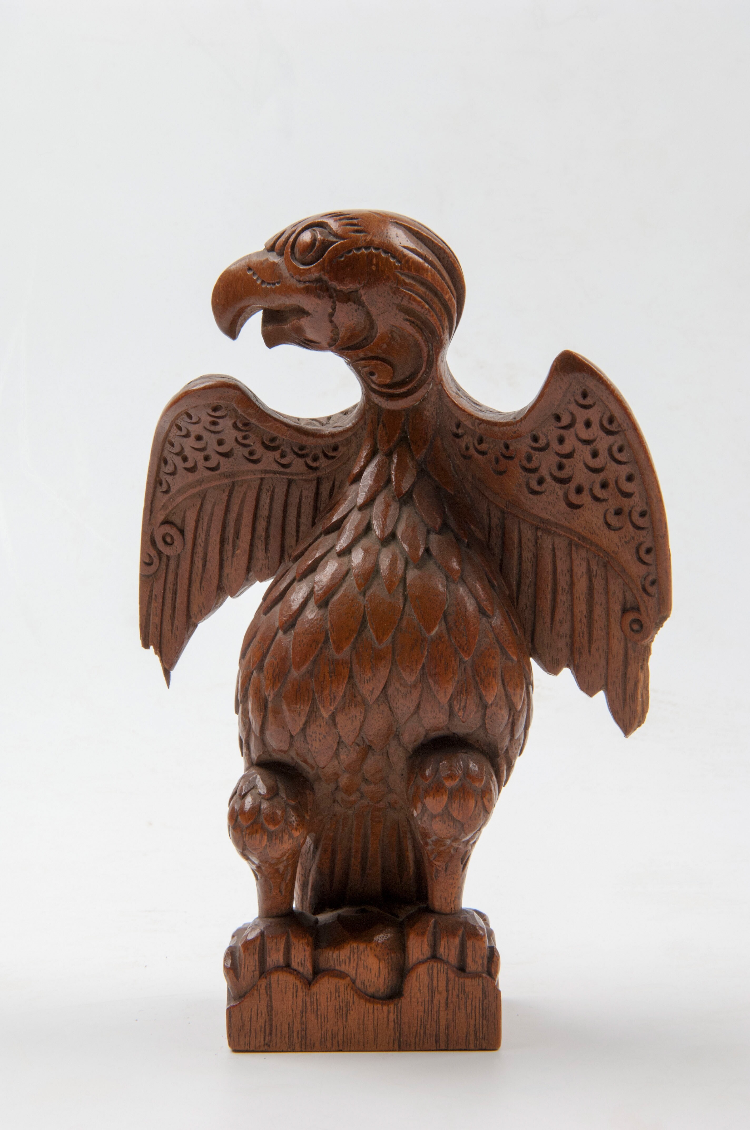 Houten beeld van een staande vogel met uitgespreide ...