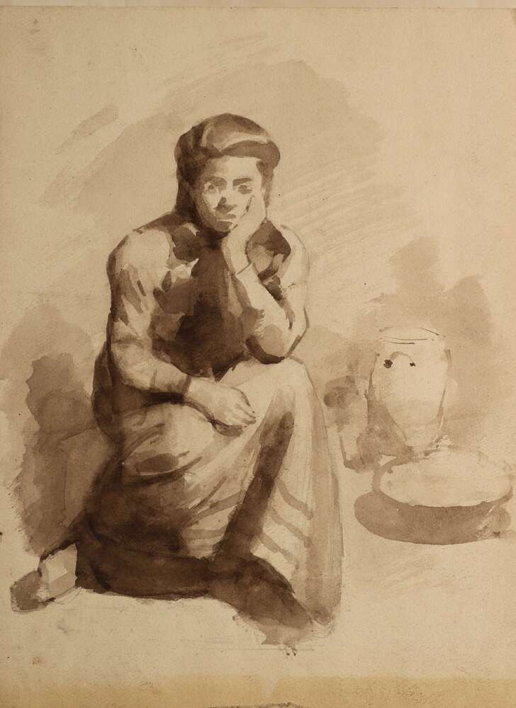 Zittende vrouw met aardewerk potten