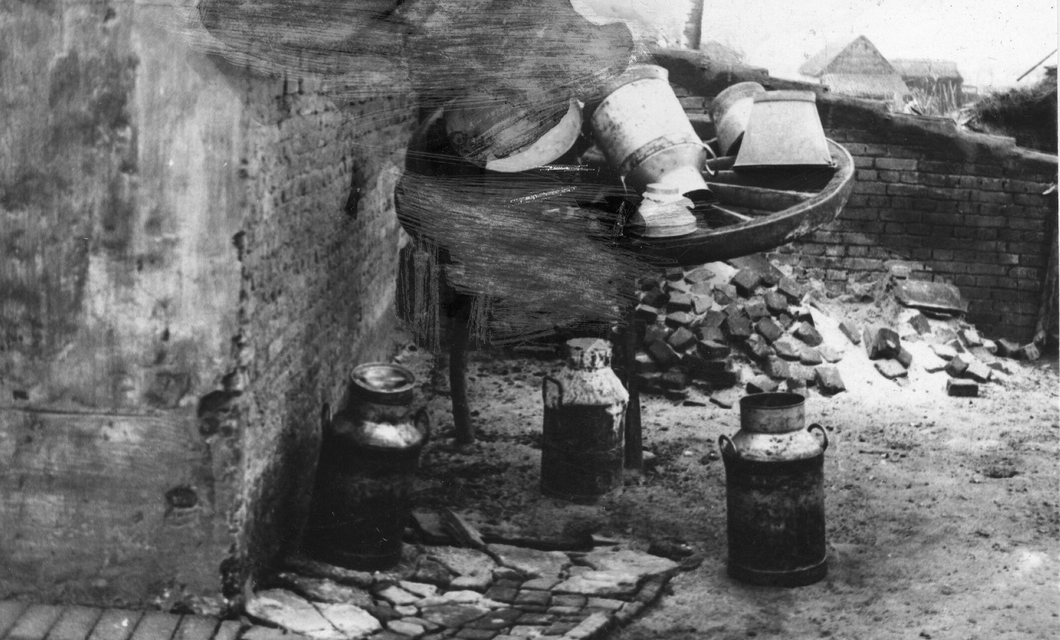 Melkbussenrek naast een mestvaalt, Beers, 1936 (zwar...