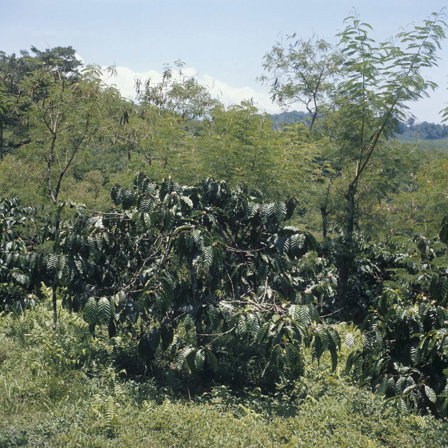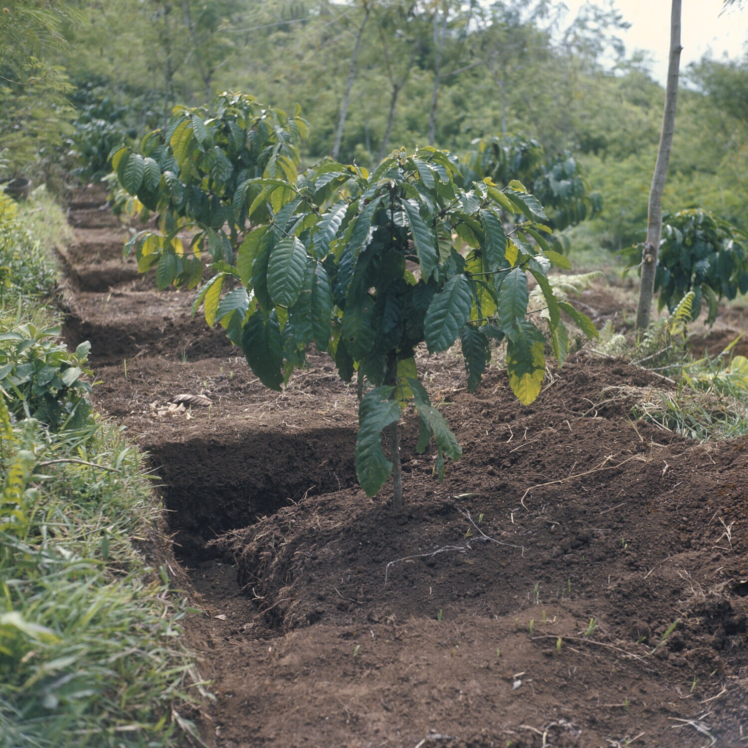Jonge koffiestruik. Koffie en caçao-onderneming 'Mal...