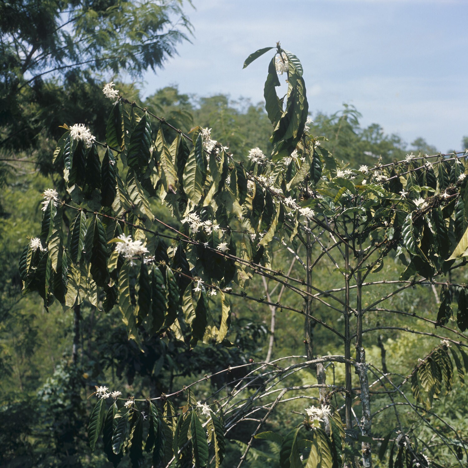 Koffiestruik in bloei. Koffie en caçao-onderneming '...