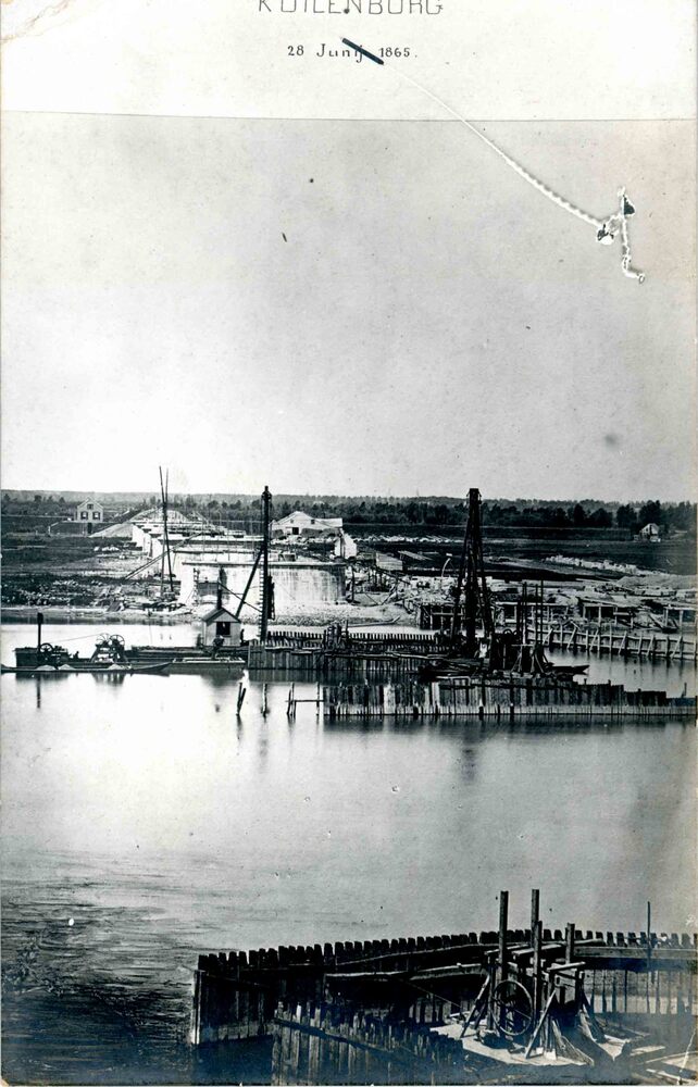 Ansichtkaart, voorstellende de bouw van spoorbrug te...