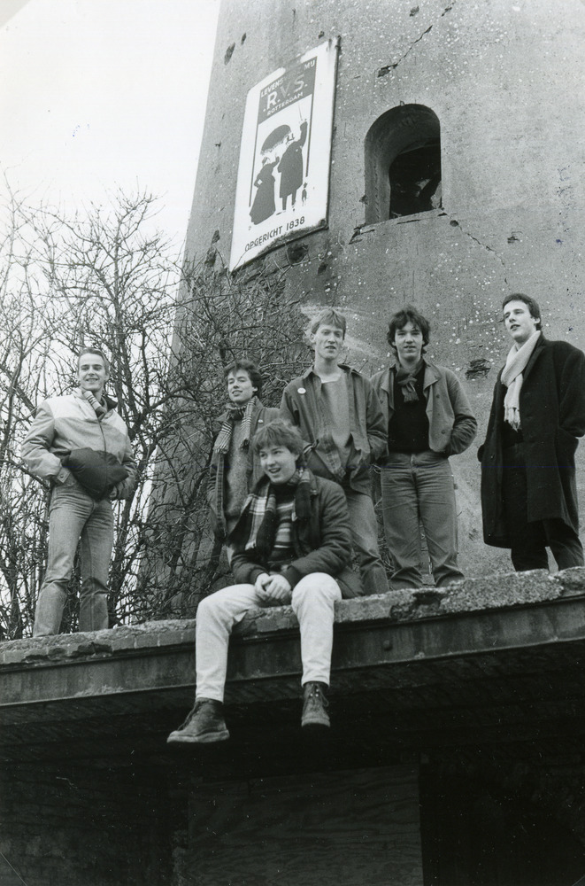 Zwart-wit foto van de popgroep Stortplaats BV te Lob...