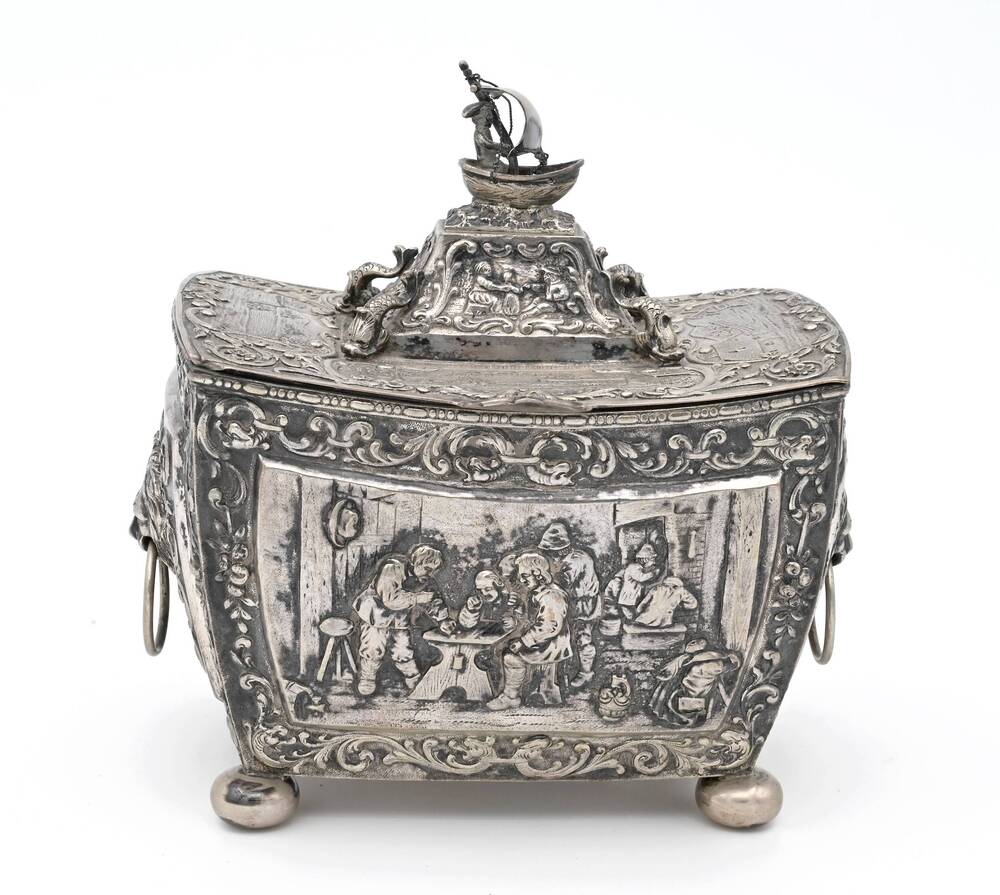 Sigarendoos van zilver voorstellende huizen, mensen ...