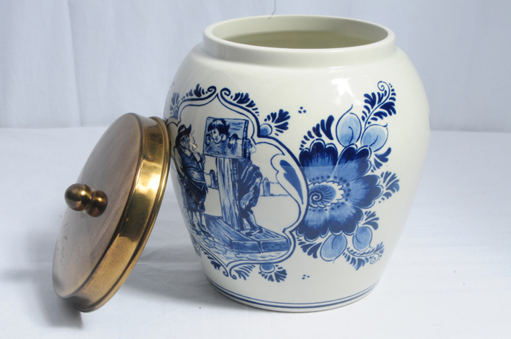 Tabakspot van geglazuurd aardewerk met koperen deksel