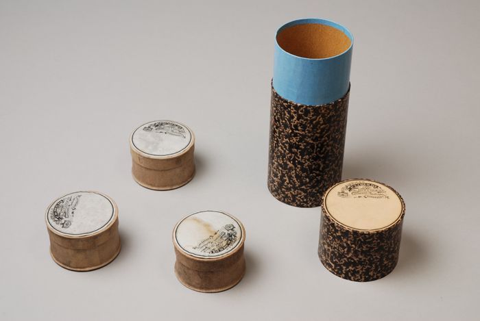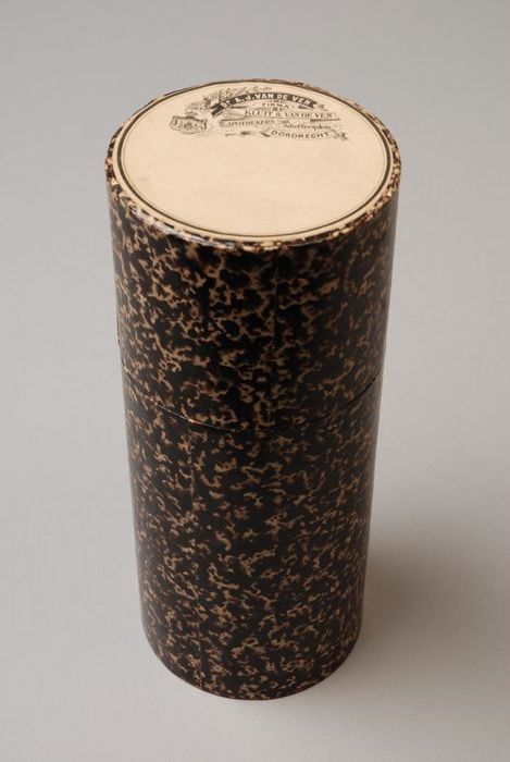 Kartonnen koker met daarin drie kartonnen pillendoze...