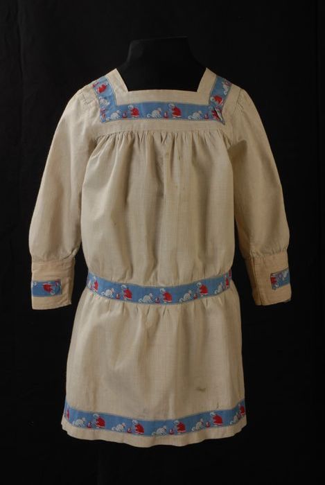 Kinderjurk, schortmodel van beige katoen met blauw s...