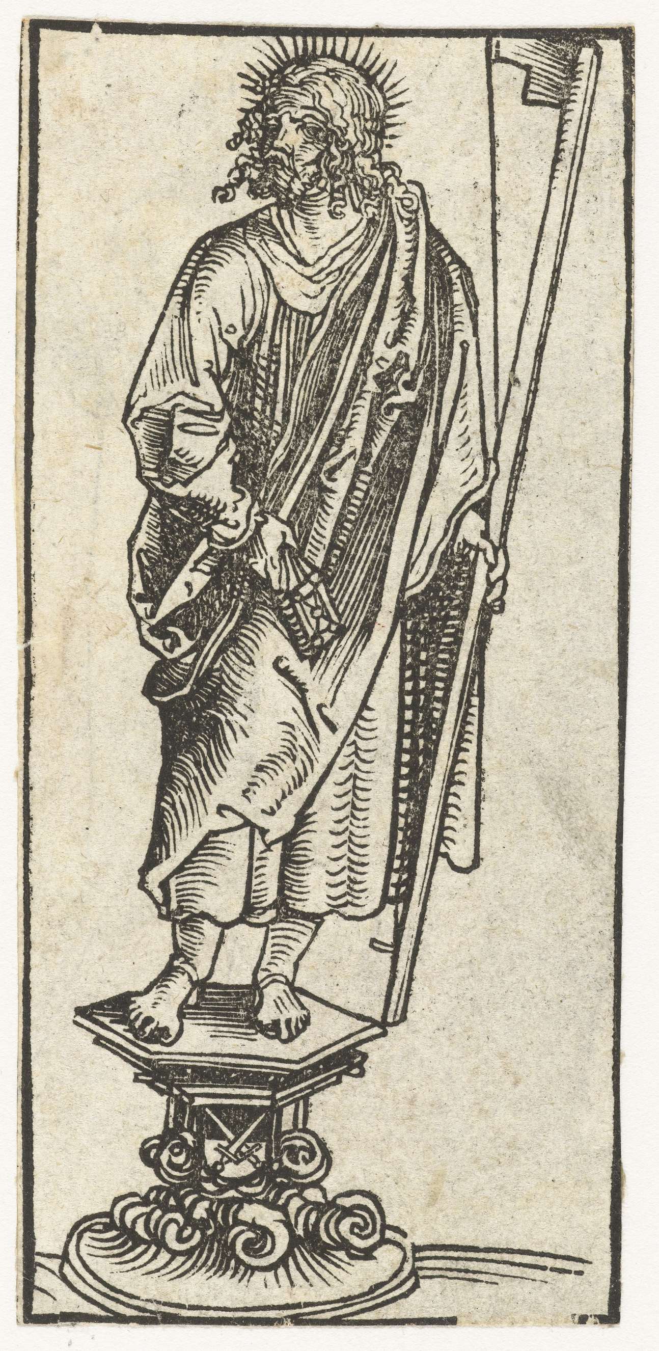 Beeld met Jakobus de Mindere met hoedenmakersboog