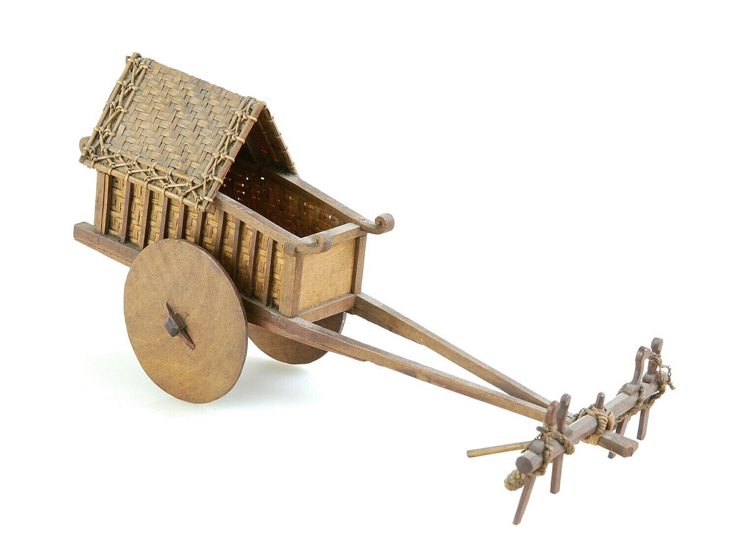 Model van een tweewielige vrachtkar met karbouwenjuk