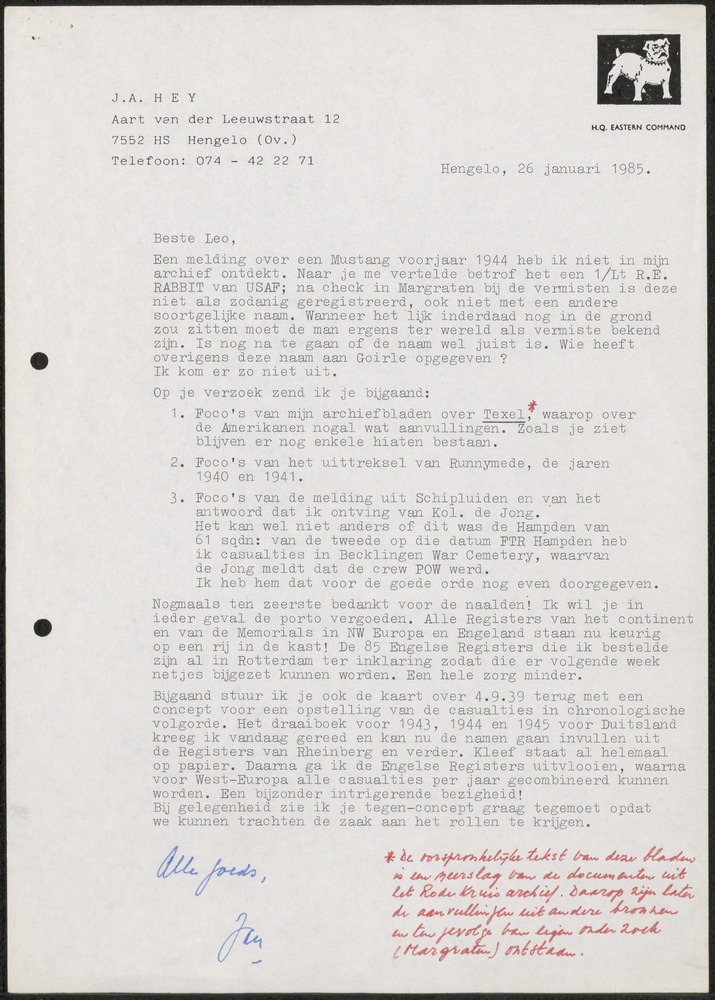 Brief van J.H. Hey aan dhr Zwaaf van 26 januari 1985