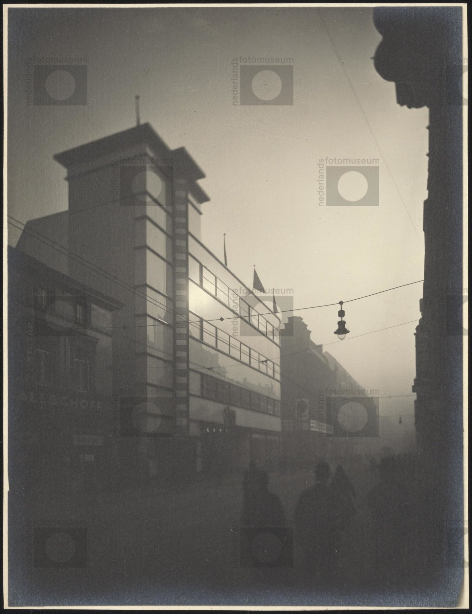 het warenhuis te Gelsenkirchten bij schemer met figu...