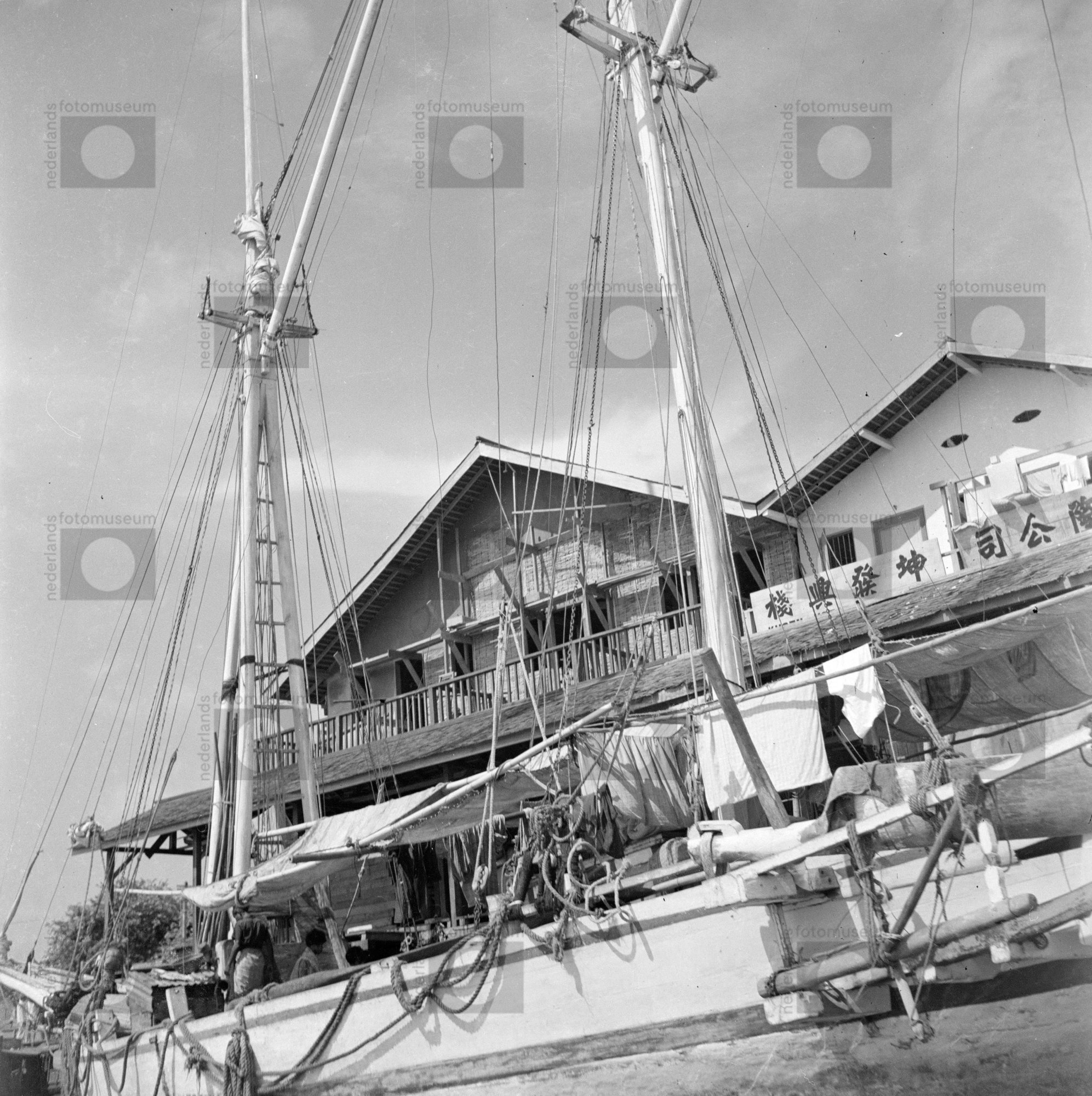 Bebouwing, deels op palen, langs haven van Pontianak...