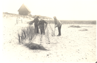Aanbrengen van bosjes riet op een zandverstuiving aa...